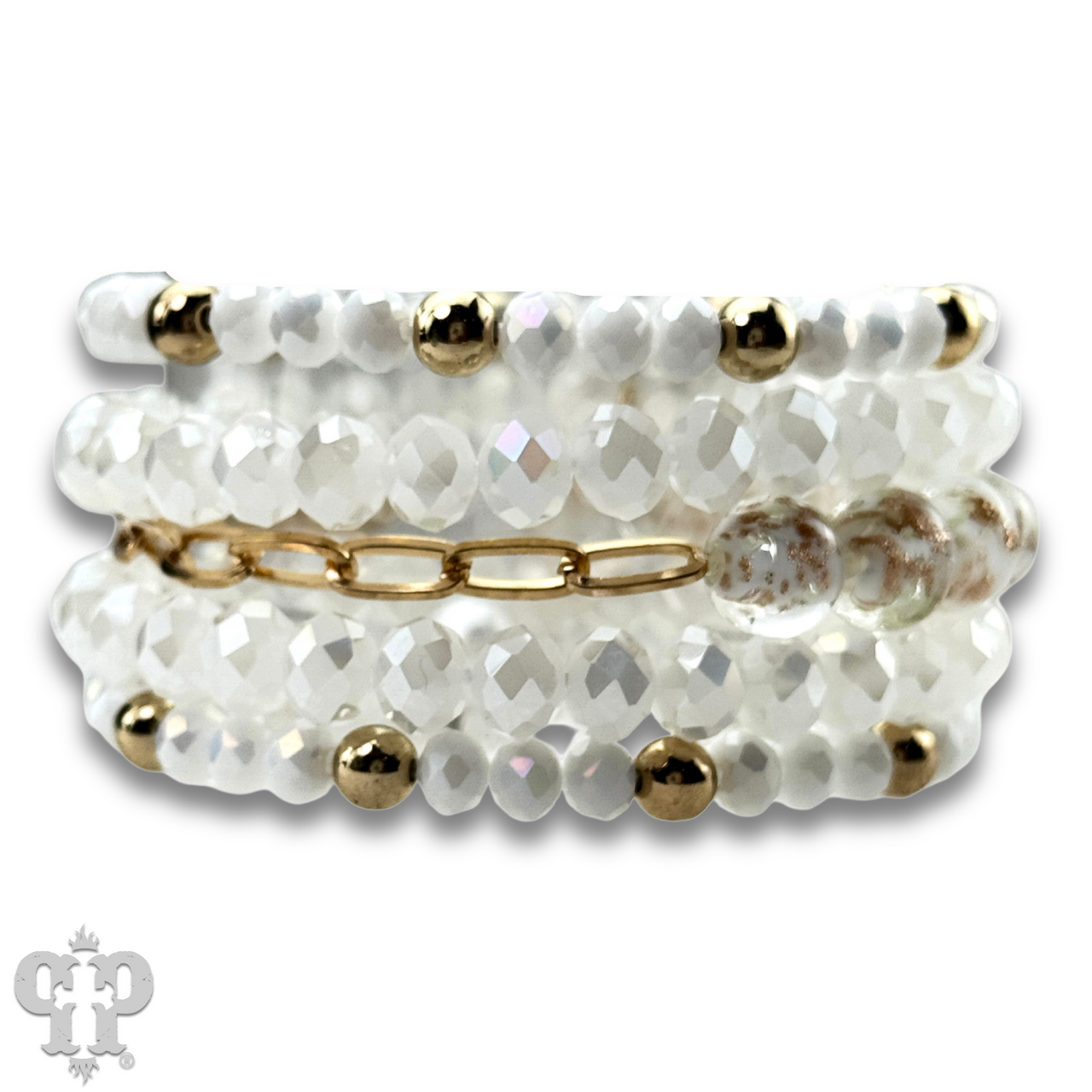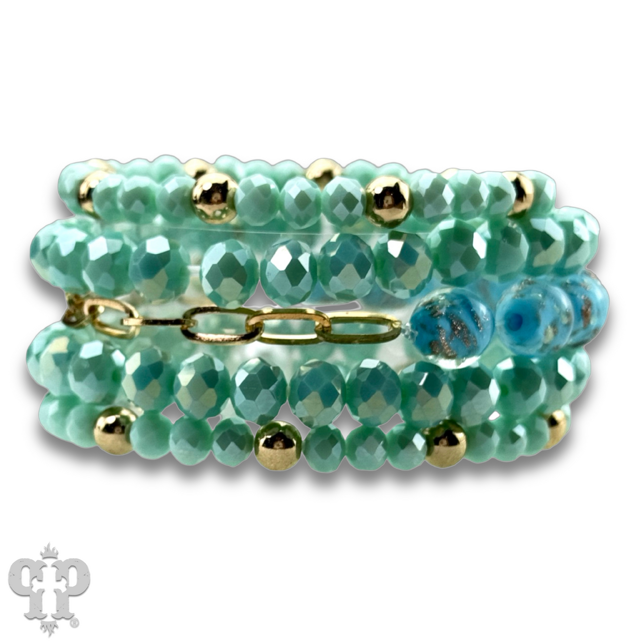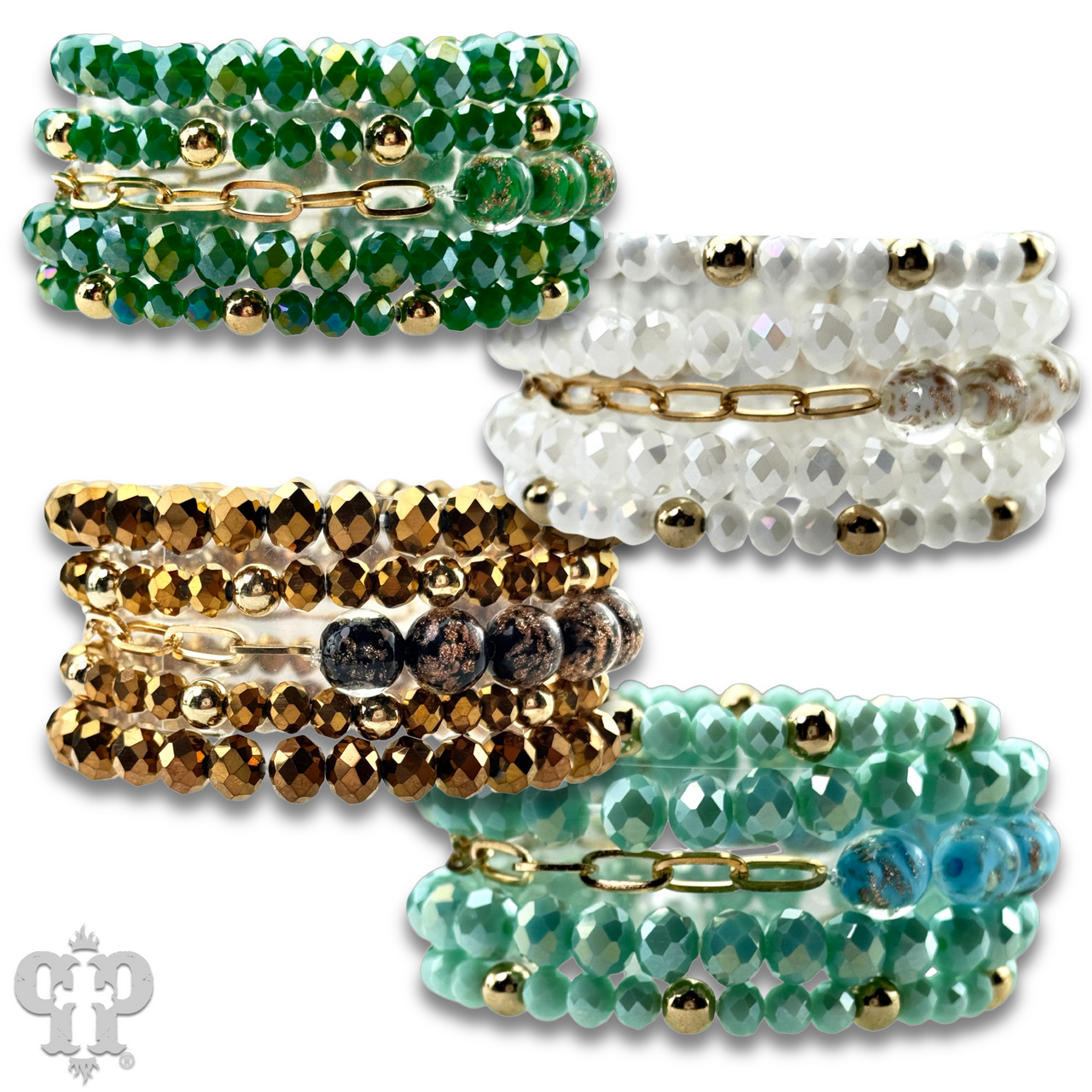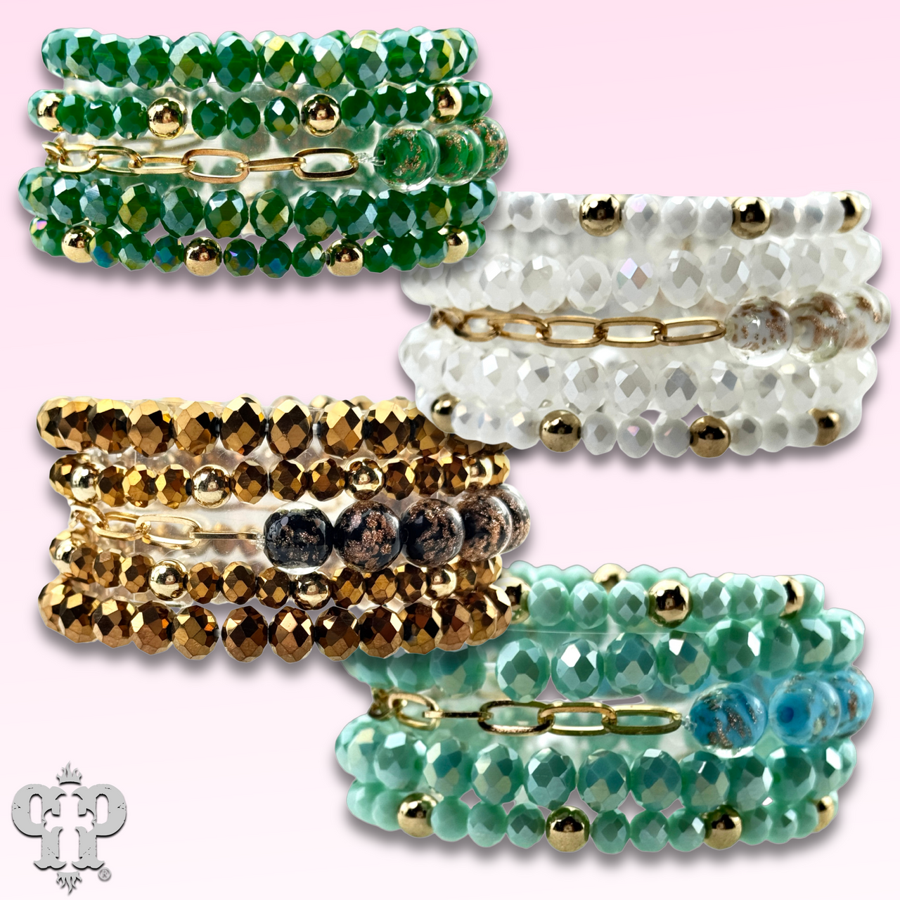 Featuring faceted beads paired with shimmering glitter glass accents the multi-layer bracelet design adds a refined sparkle to any style. It stretches for ease of wear.
