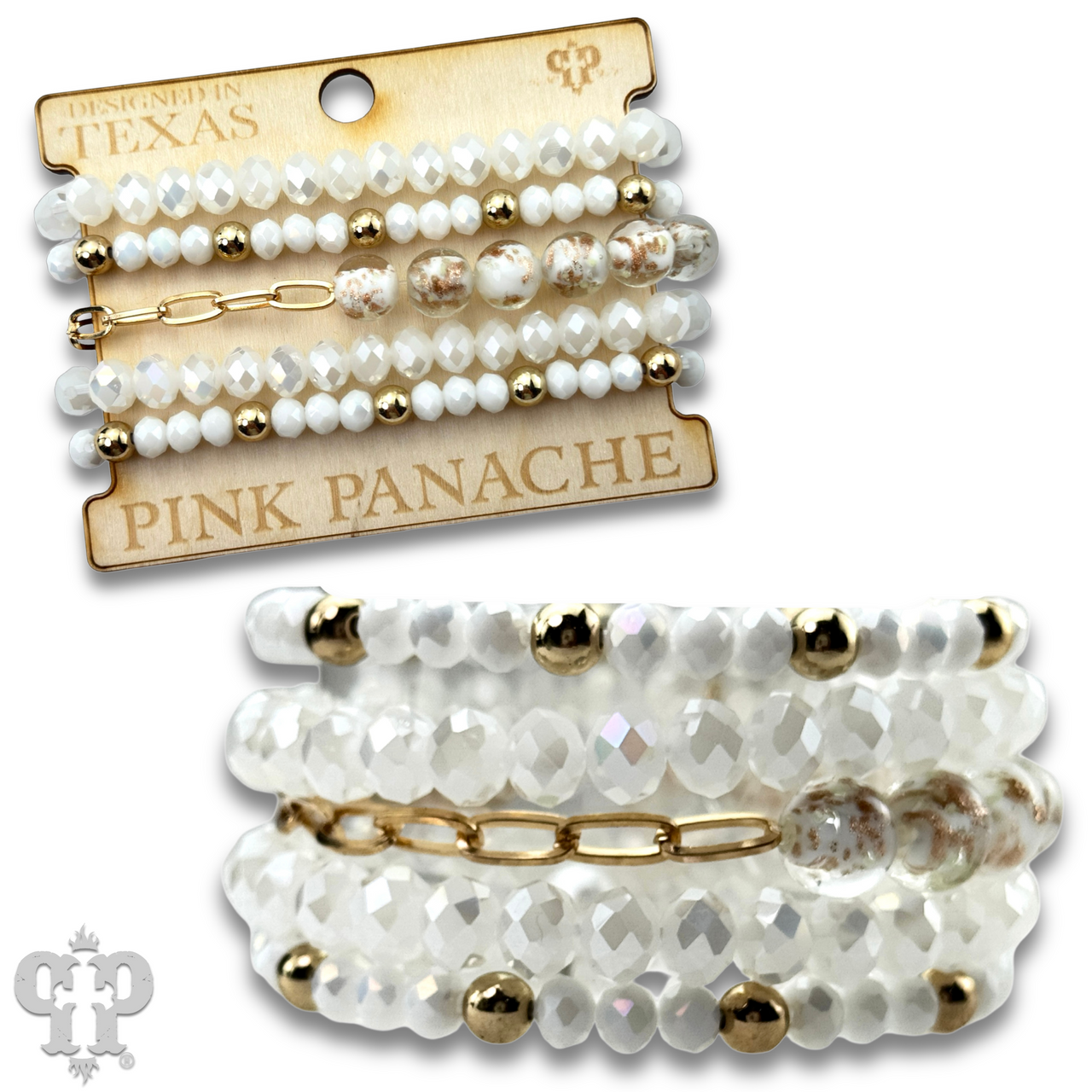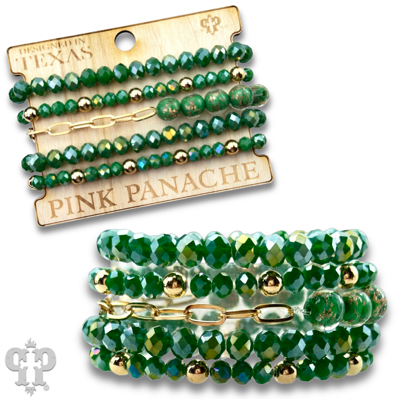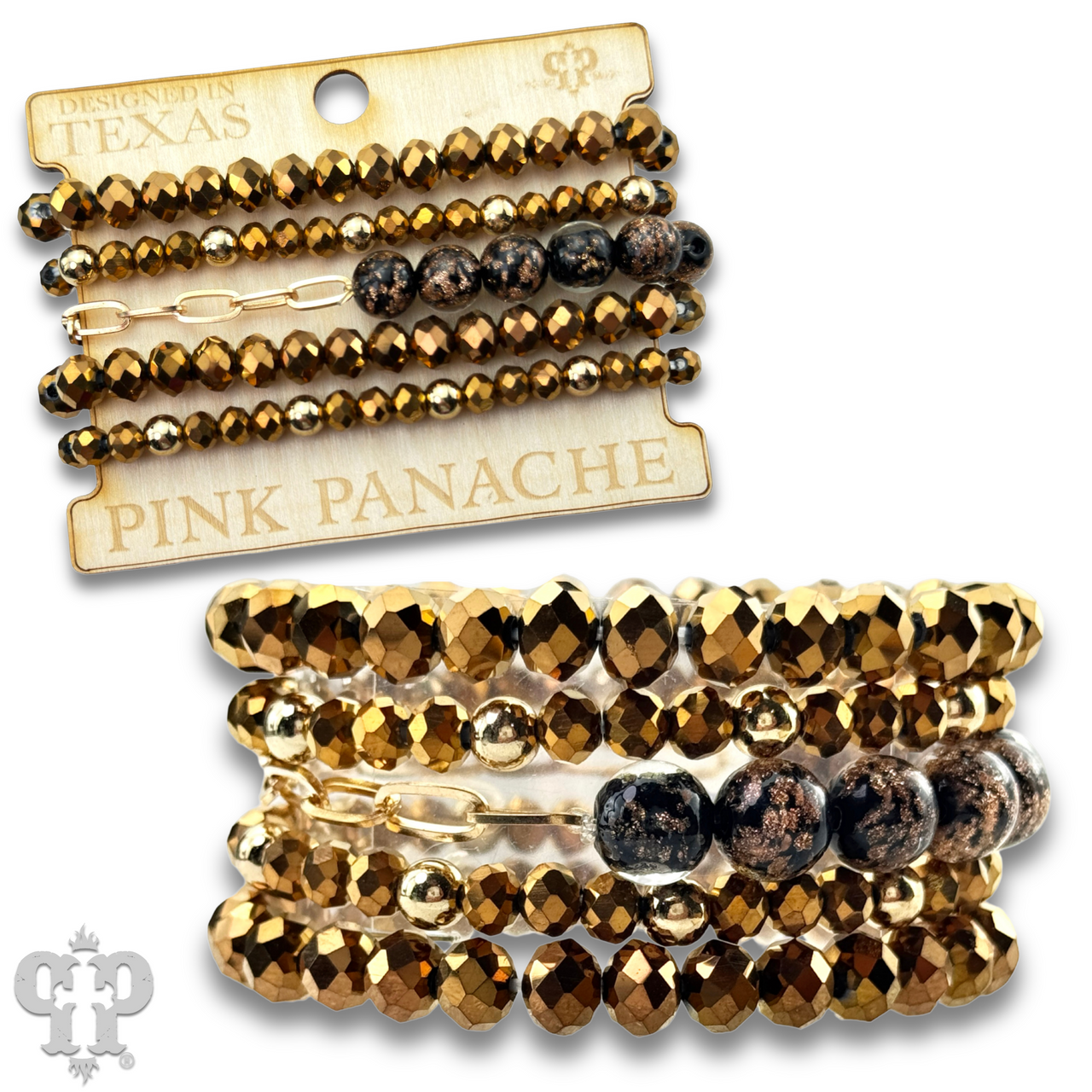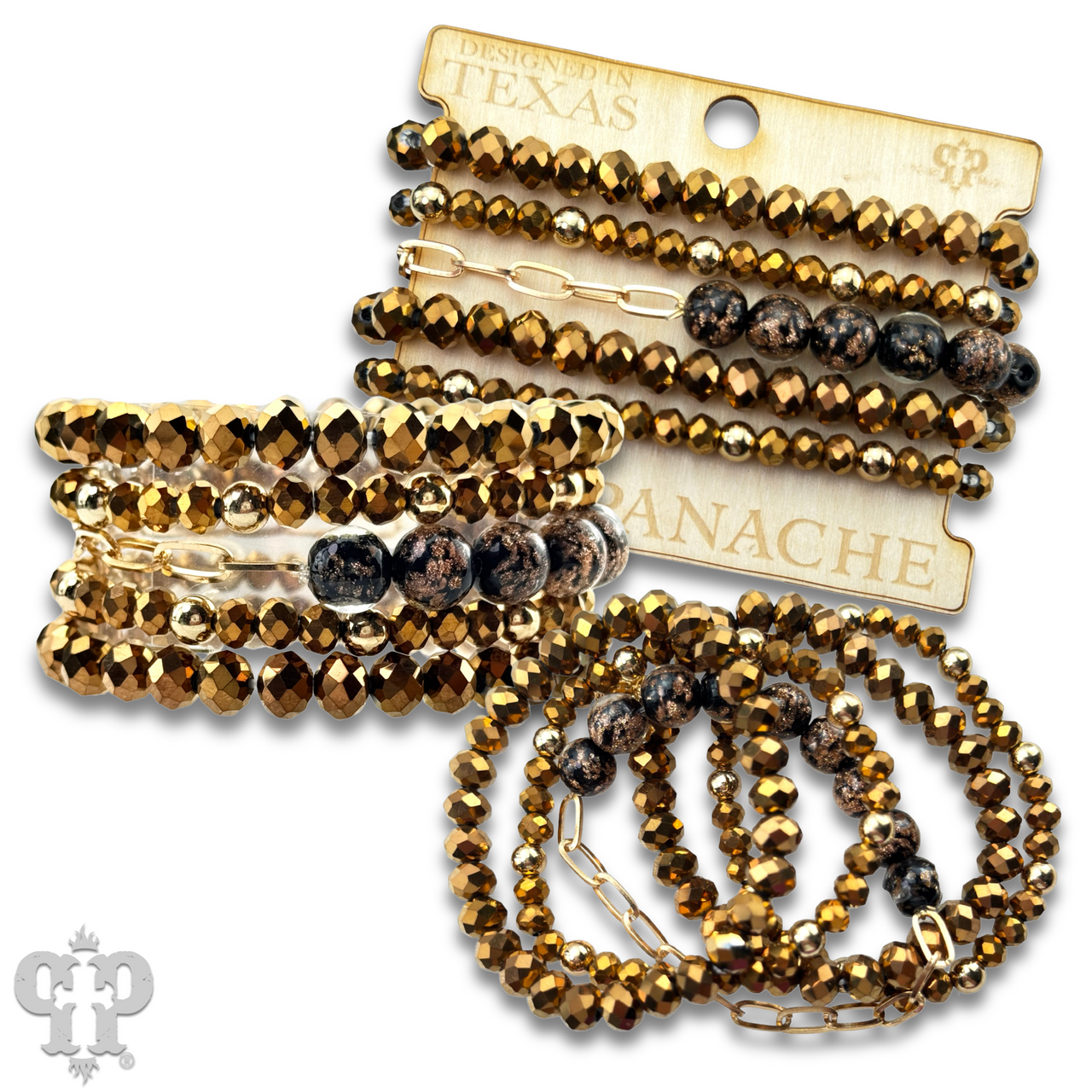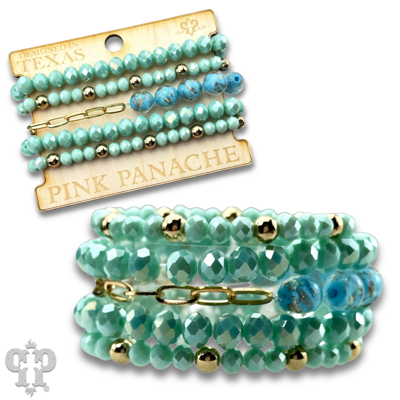 Featuring faceted beads paired with shimmering glitter glass accents the multi-layer bracelet design adds a refined sparkle to any style. It stretches for ease of wear.
