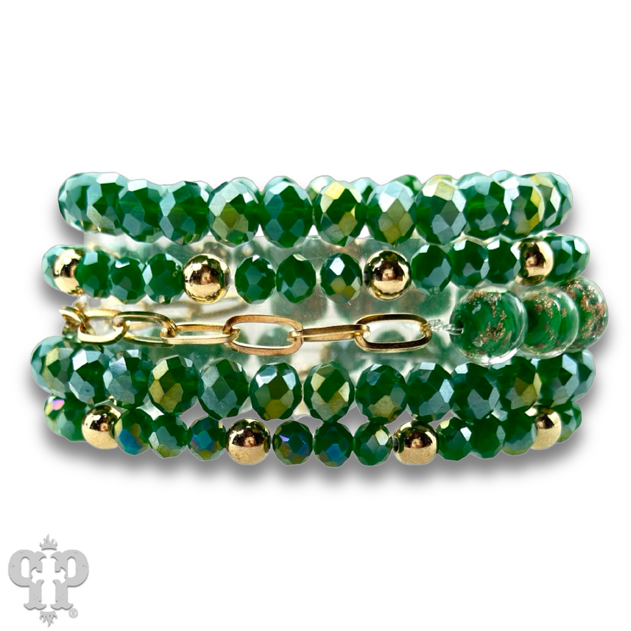 Five strand faceted bead and glitter glass bracelet