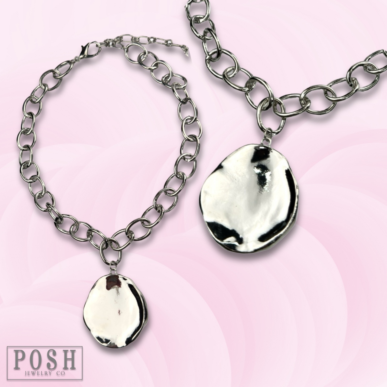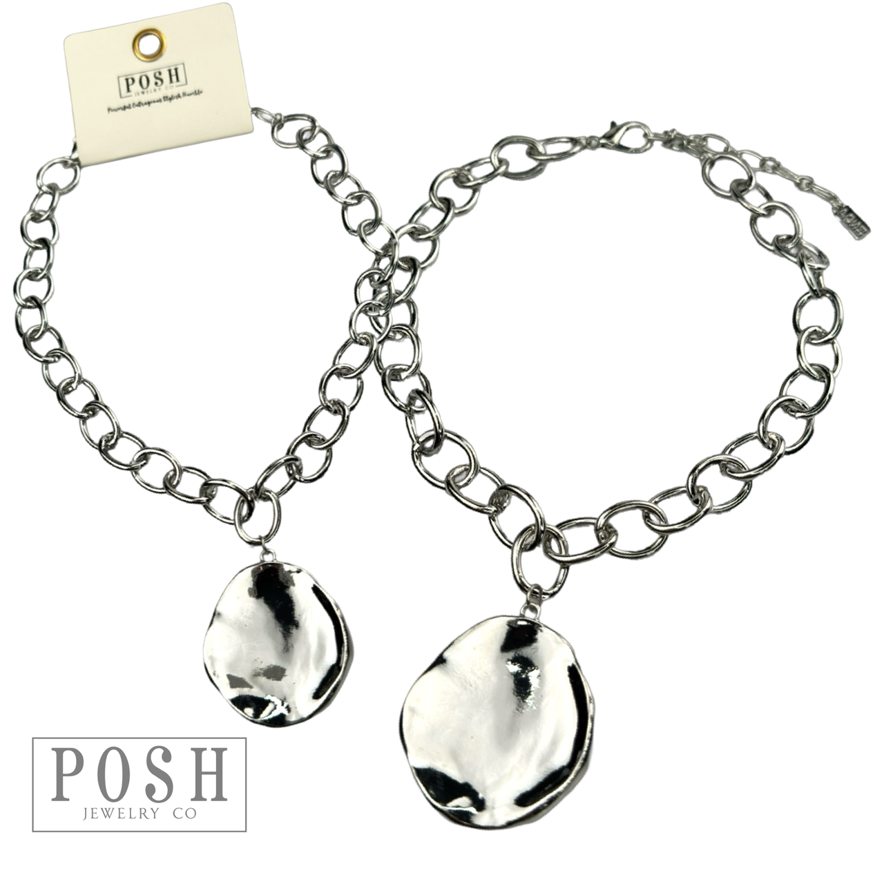 Metal tone link chain choker necklace with free-form circular, medallion style pendant. Necklace is choker length.