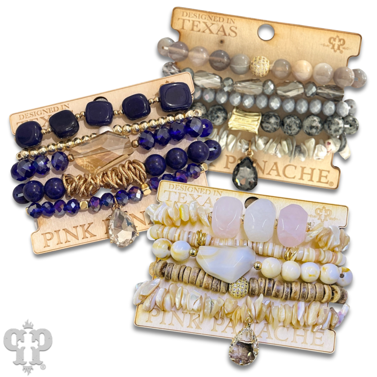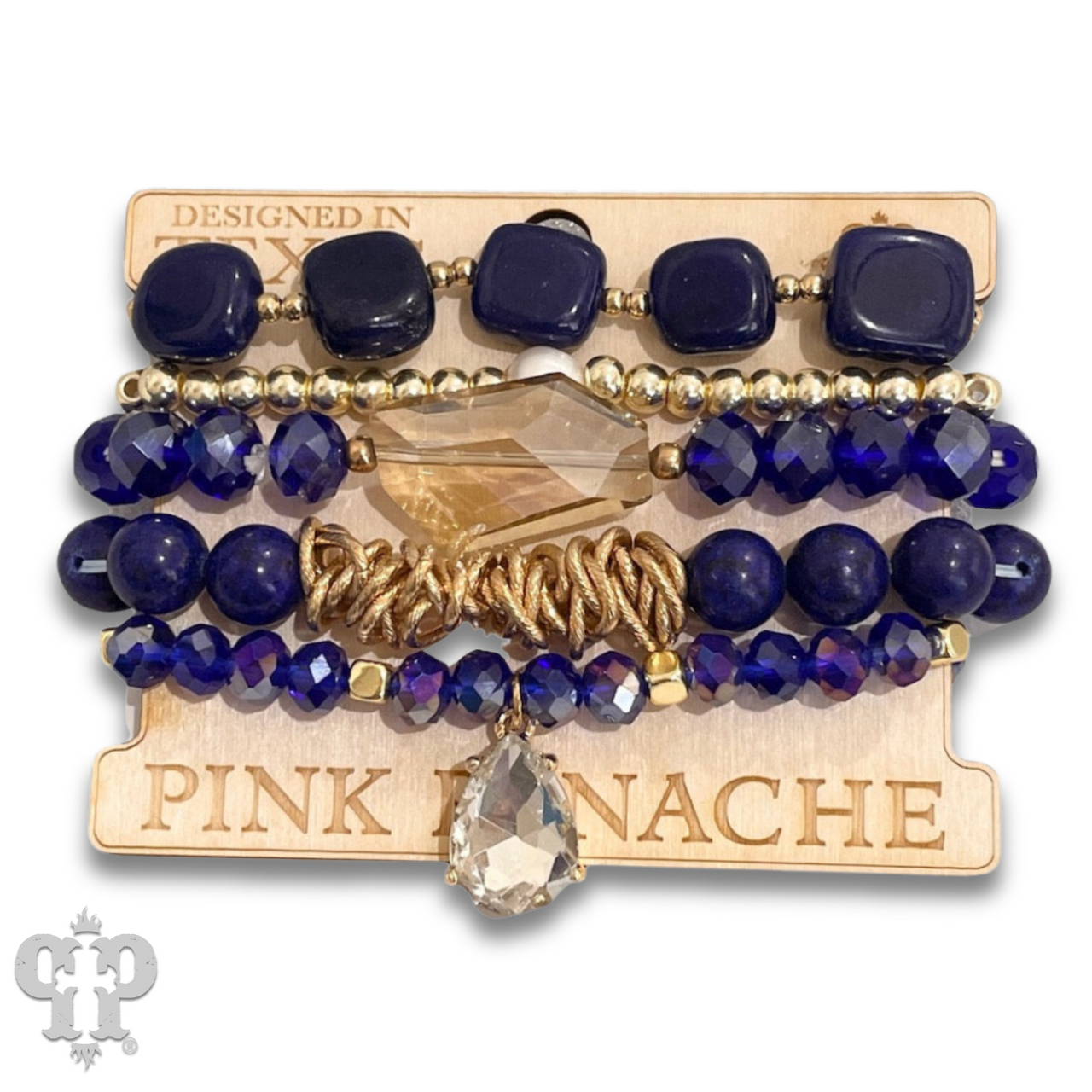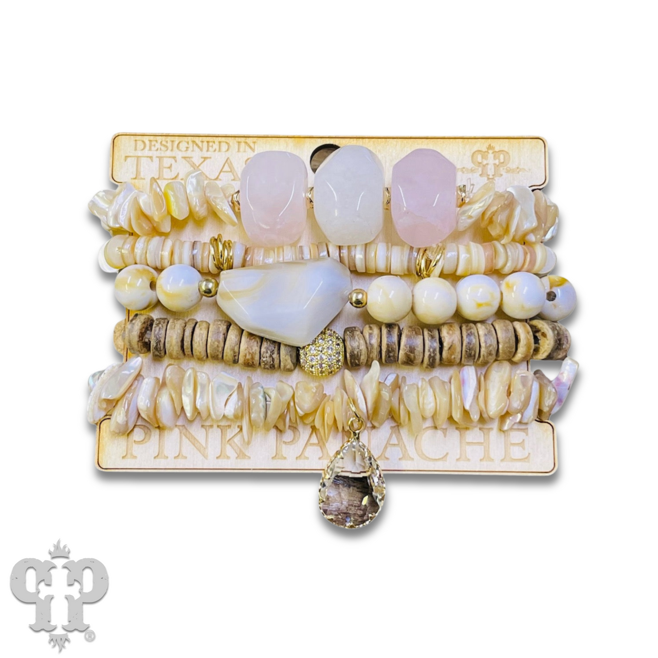 This statement bracelet includes five strands of beads in various sizes and textures. The charm is