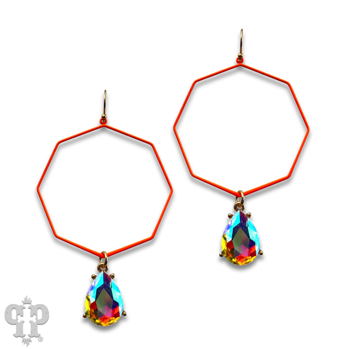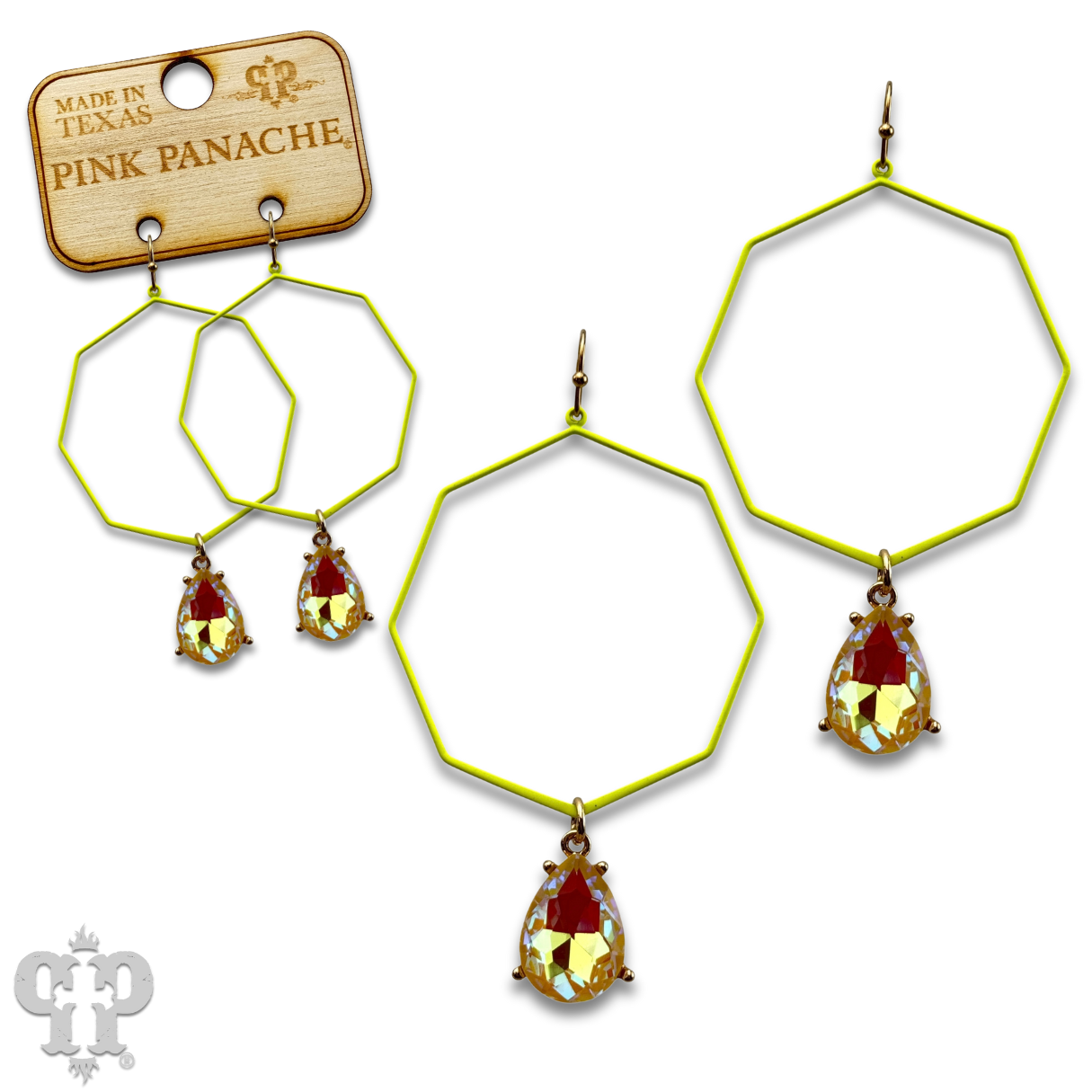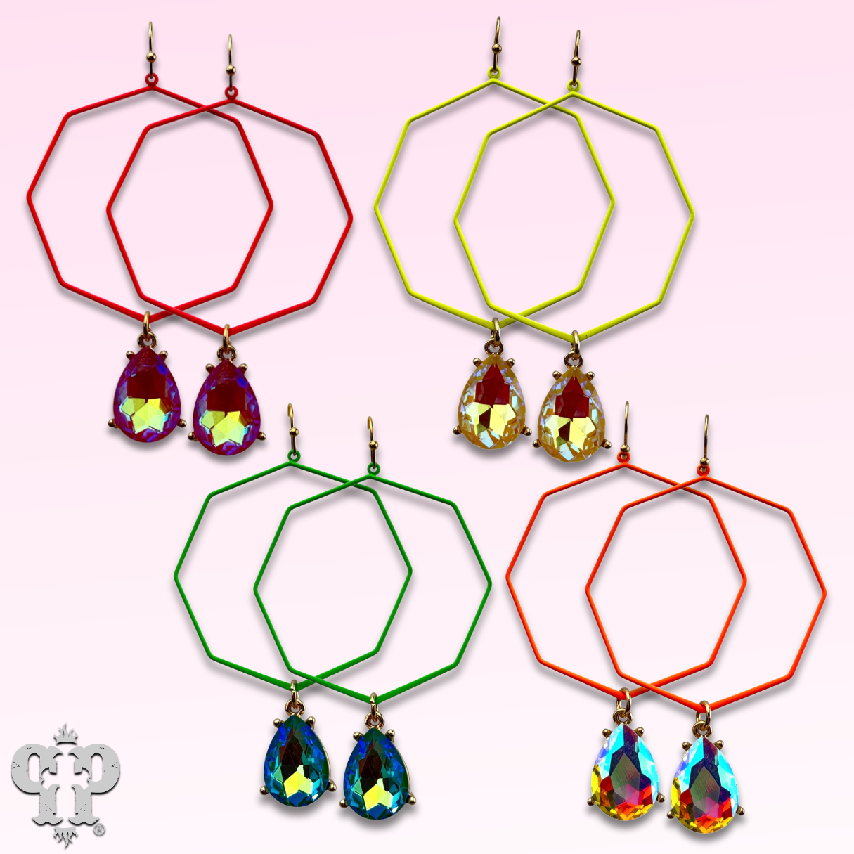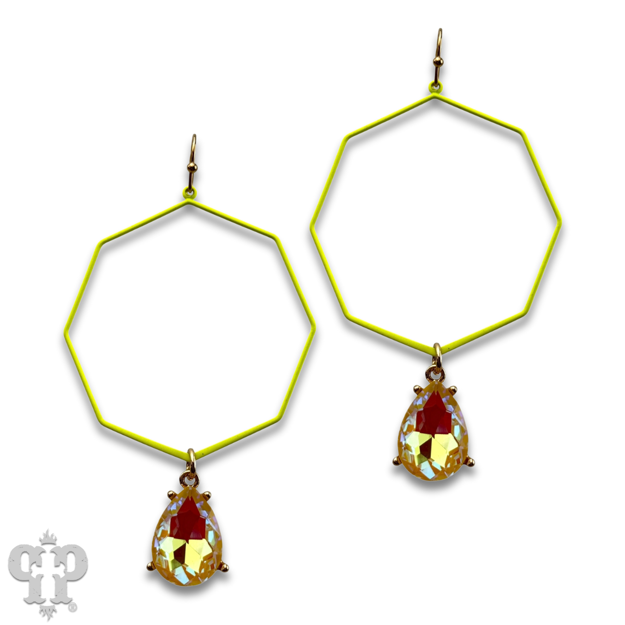 Get ready to glow with these neon octagon earrings featuring an iridescent teardrop rhinestone