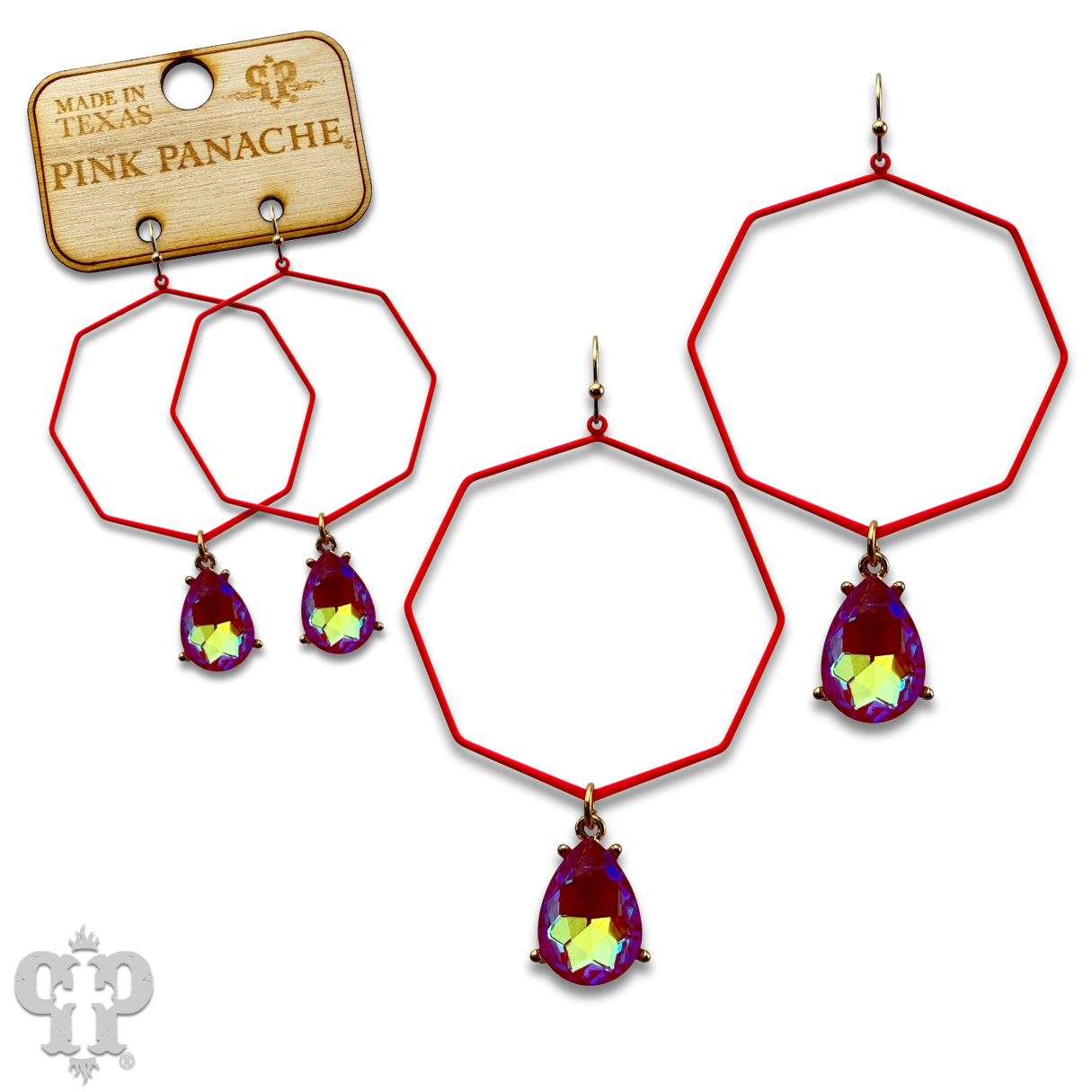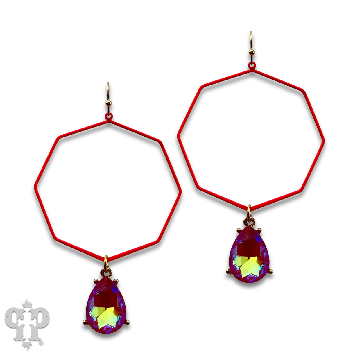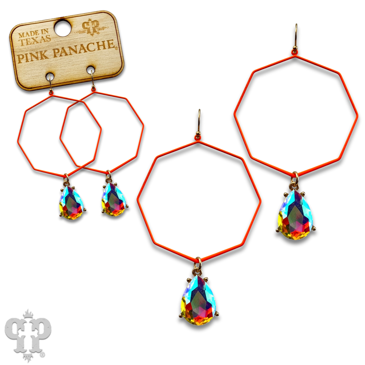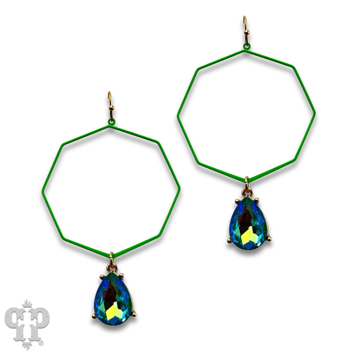Get ready to glow with these neon octagon earrings featuring an iridescent teardrop rhinestone