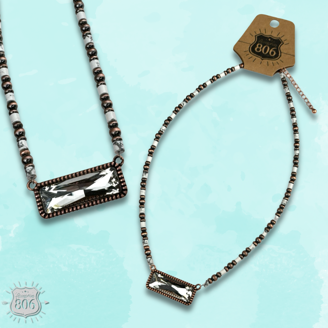 Embrace the dazzling style of this necklace featuring burnished metal tone beads and tube shaped stone beads mixed in. The pendant holds a sparkling faceted clear rhinestone in a textured metal tone rectangle setting.