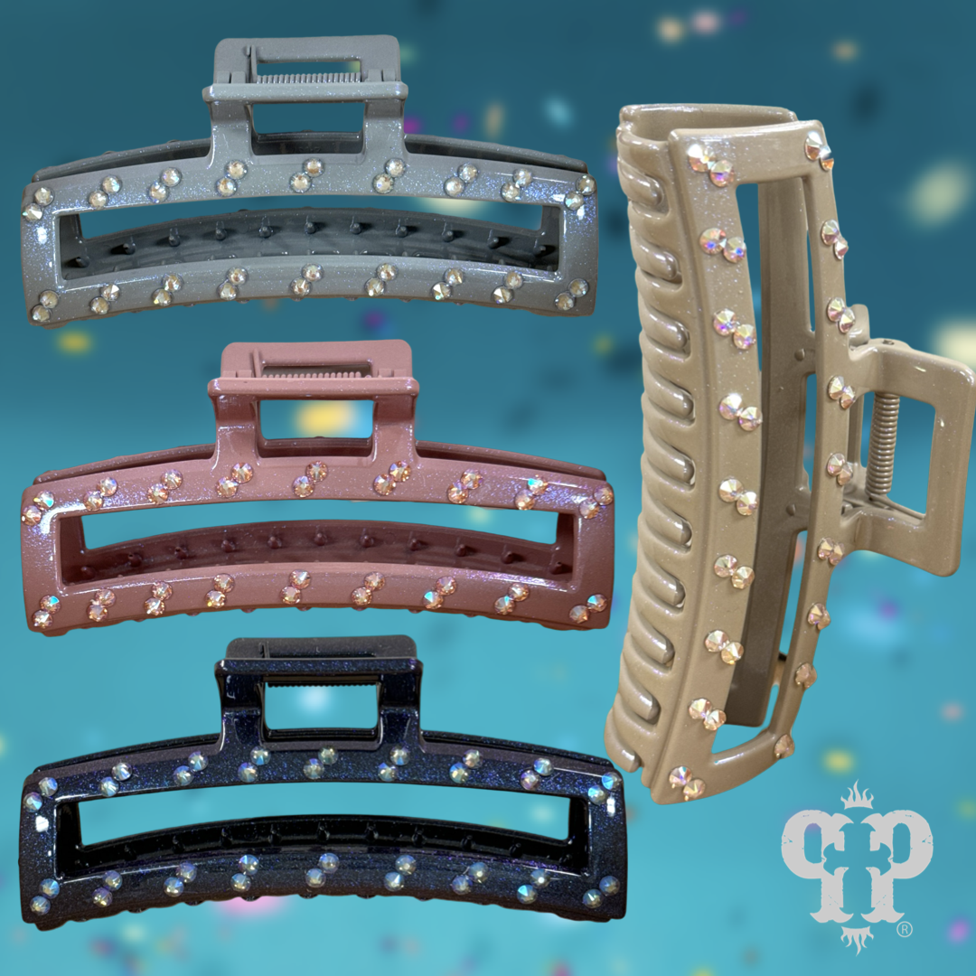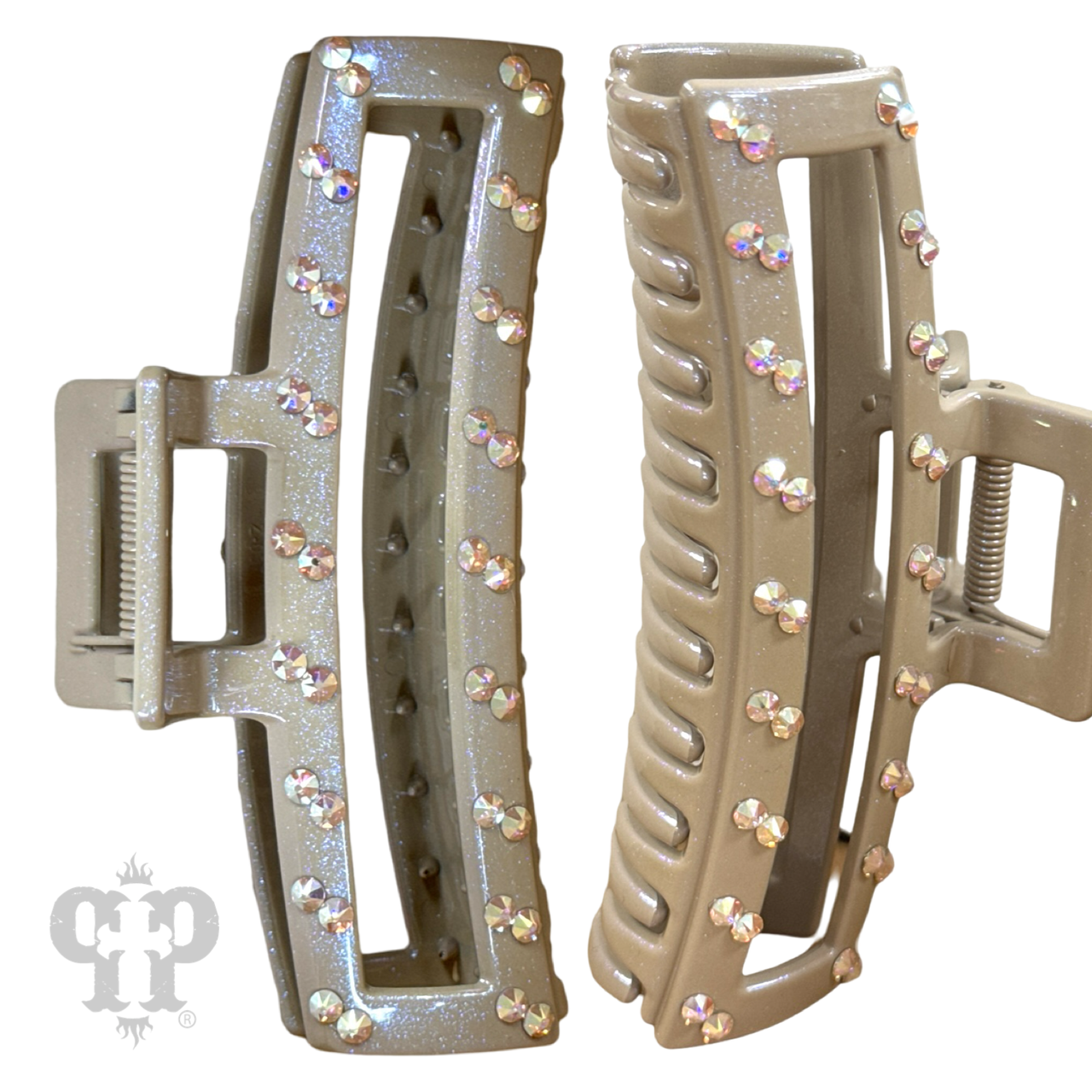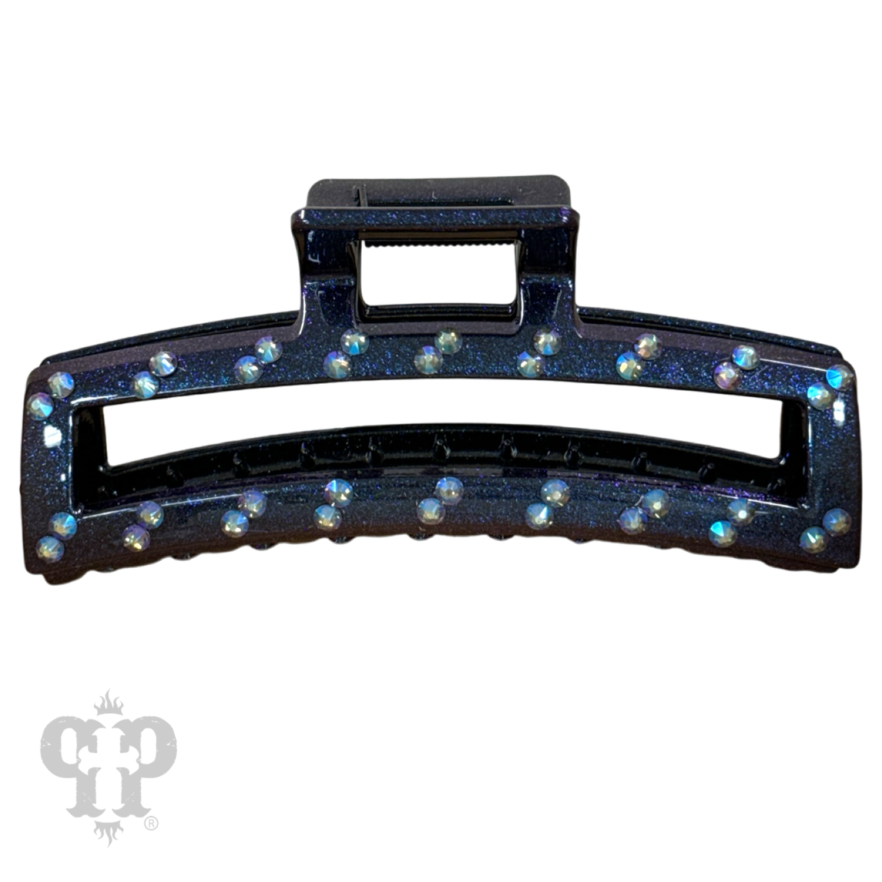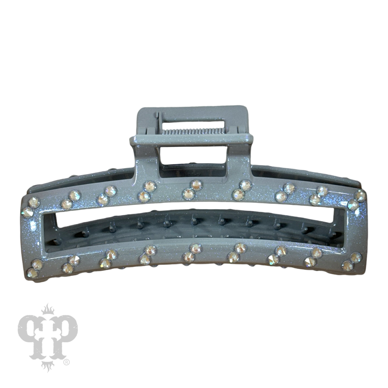 This large hair claw/clip has a glitter shimmer finish with a hand set pattern of Austrian crystals.
