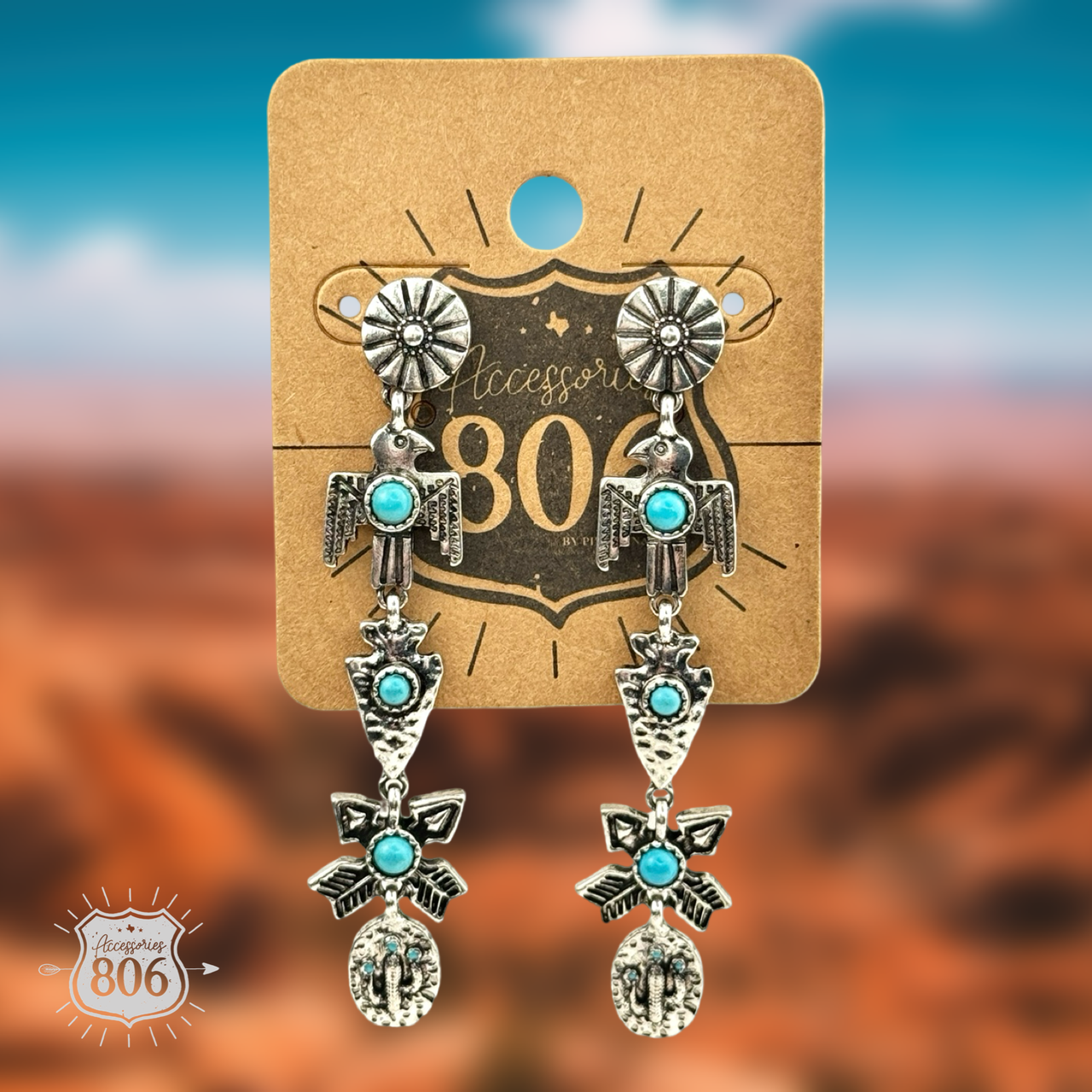Southwest style earring has silver tone thunderbird, arrows and cactus charms linked and hanging from a western style concho post setting.