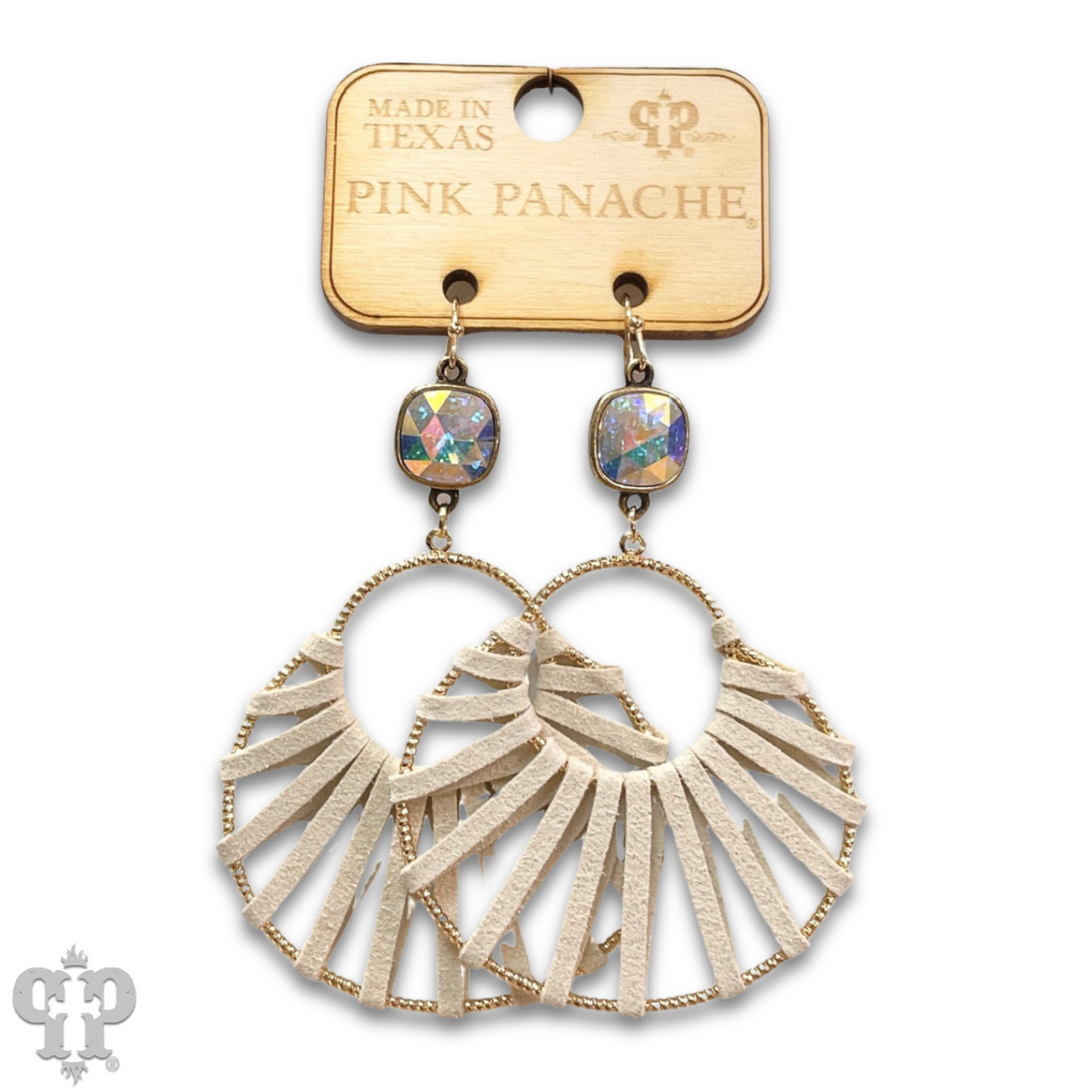 Go out in style with these funky suede wrapped circle earrings featuring sparkling Austrian crystals.