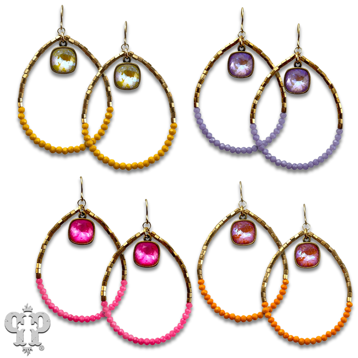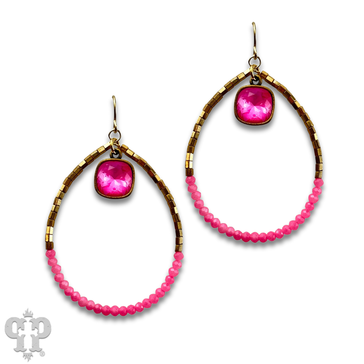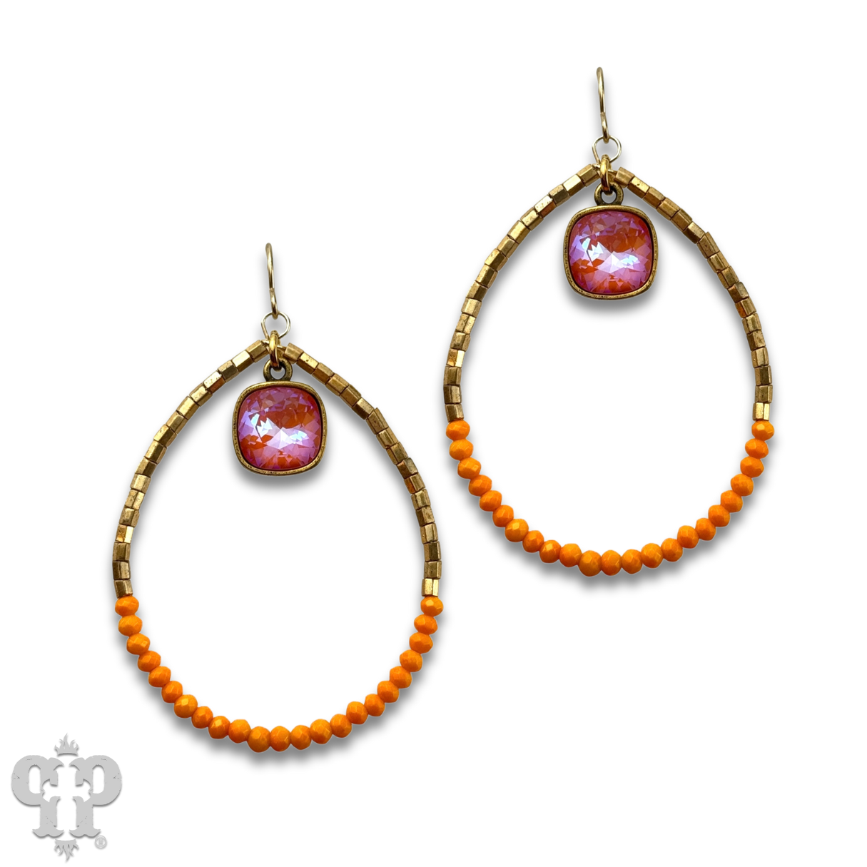 This earring has gold tone teardrop is adorned with tiny bright seed beads. It features a 10mm Austrian crystal drop in a setting custom made for Pink Panache in the USA.