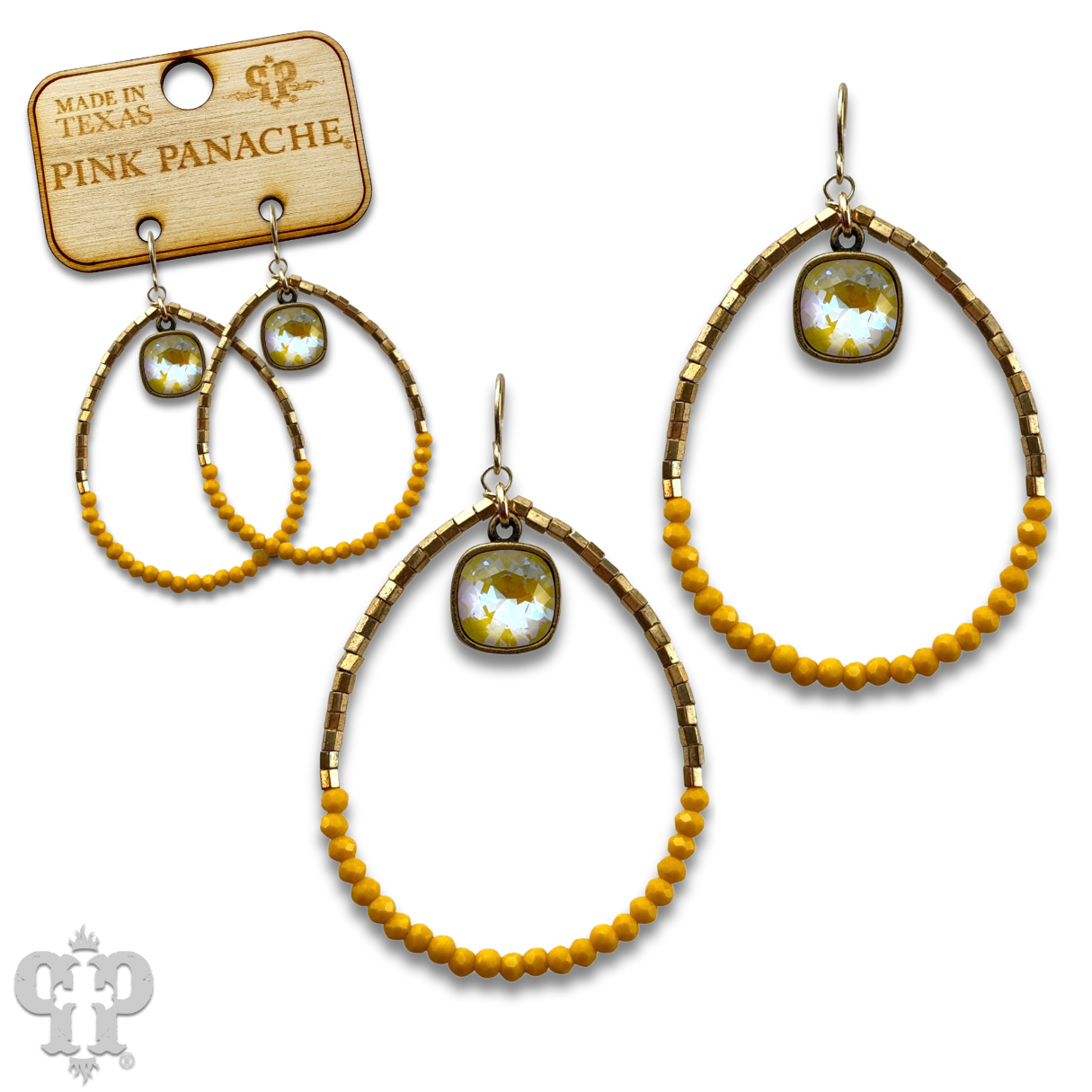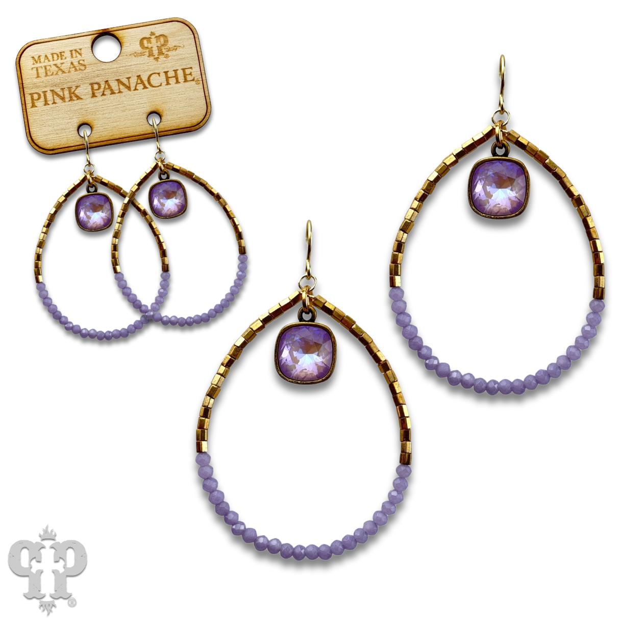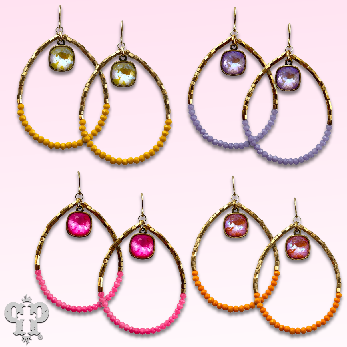This earring has gold tone teardrop is adorned with tiny bright seed beads. It features a 10mm Austrian crystal drop in a setting custom made for Pink Panache in the USA.