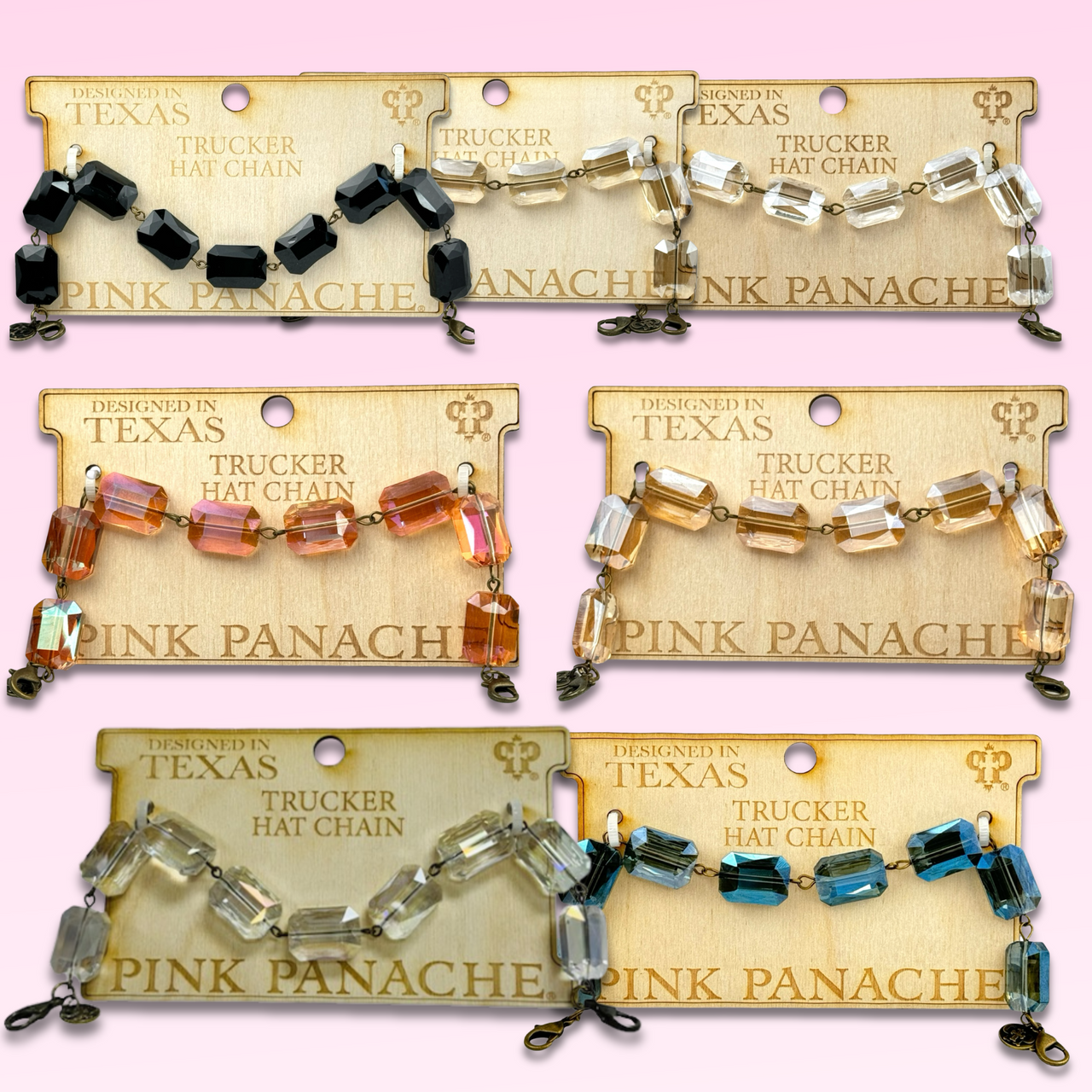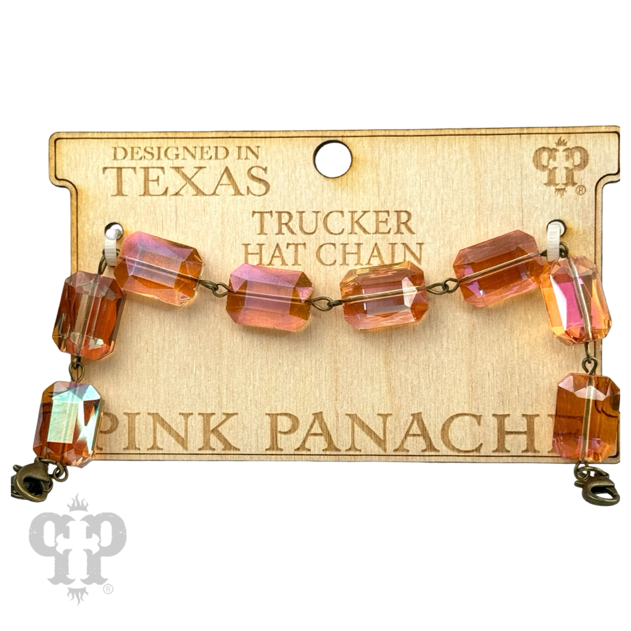 Dress up the trucker hat with these faceted large rectangle shape crystals linked into a chain. The lobster clasp on either end make it easy to change them out with other chains.