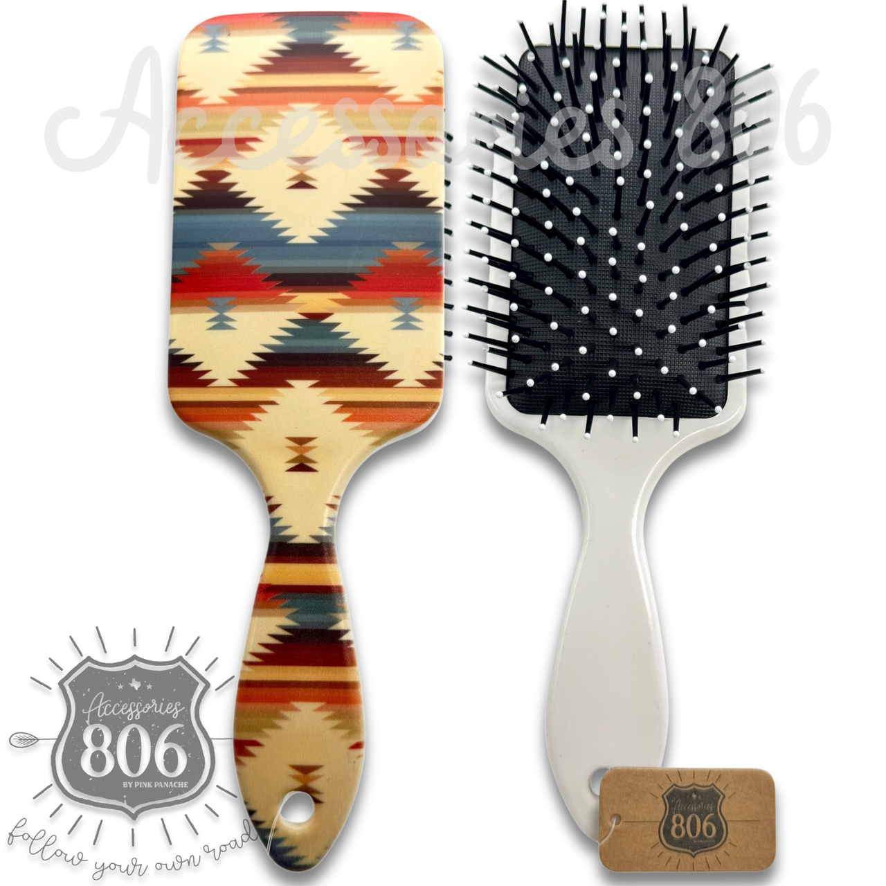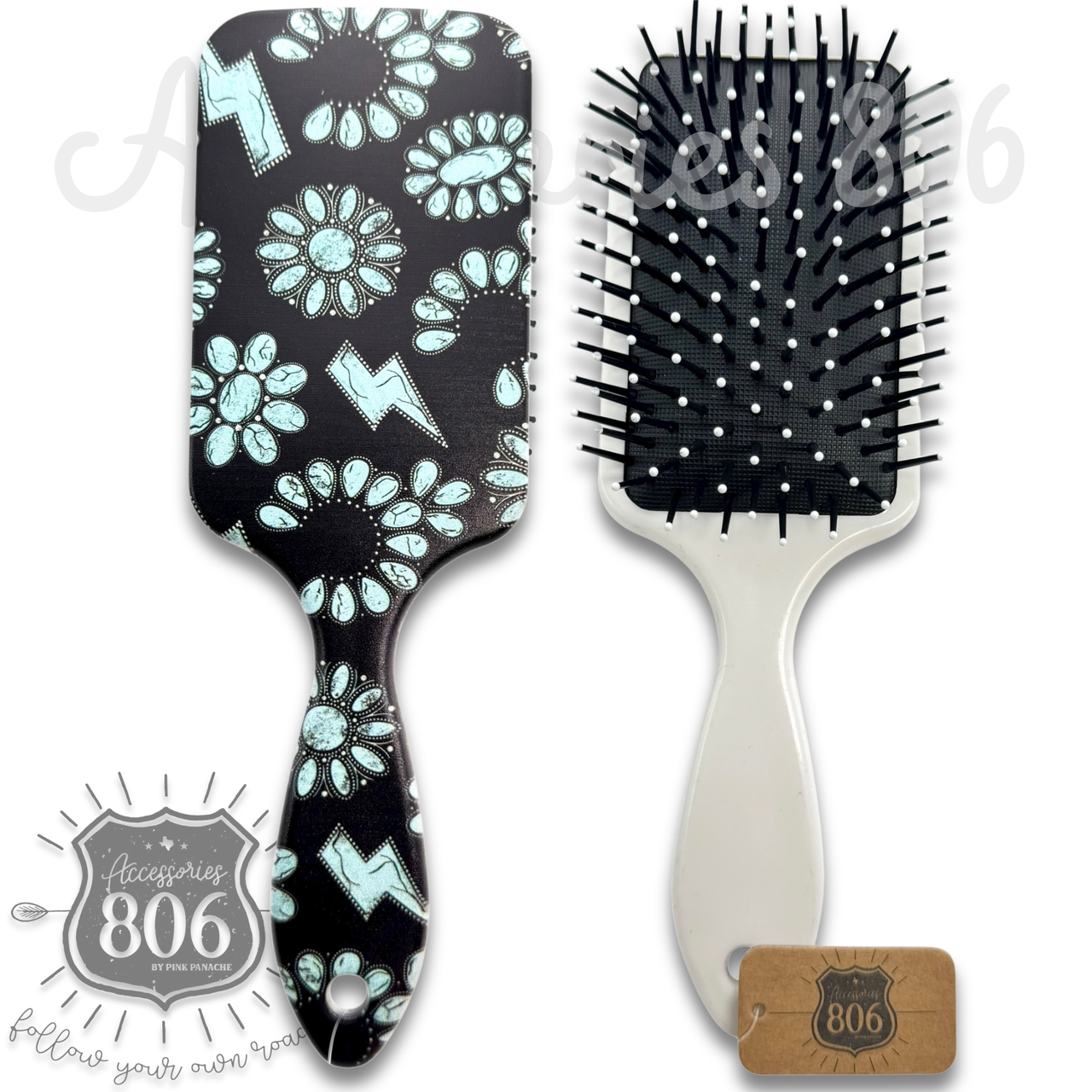 This western print hairbrush has a variety of designs for everyone!  It is a paddle brush with rubber tip nylon bristles and a hole at the end of the handle for easy hanging or hooking on your bag.