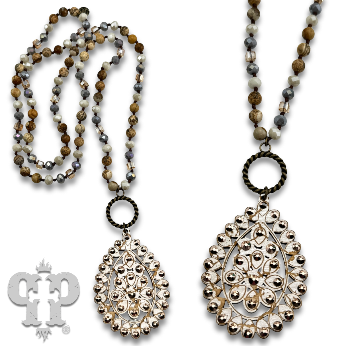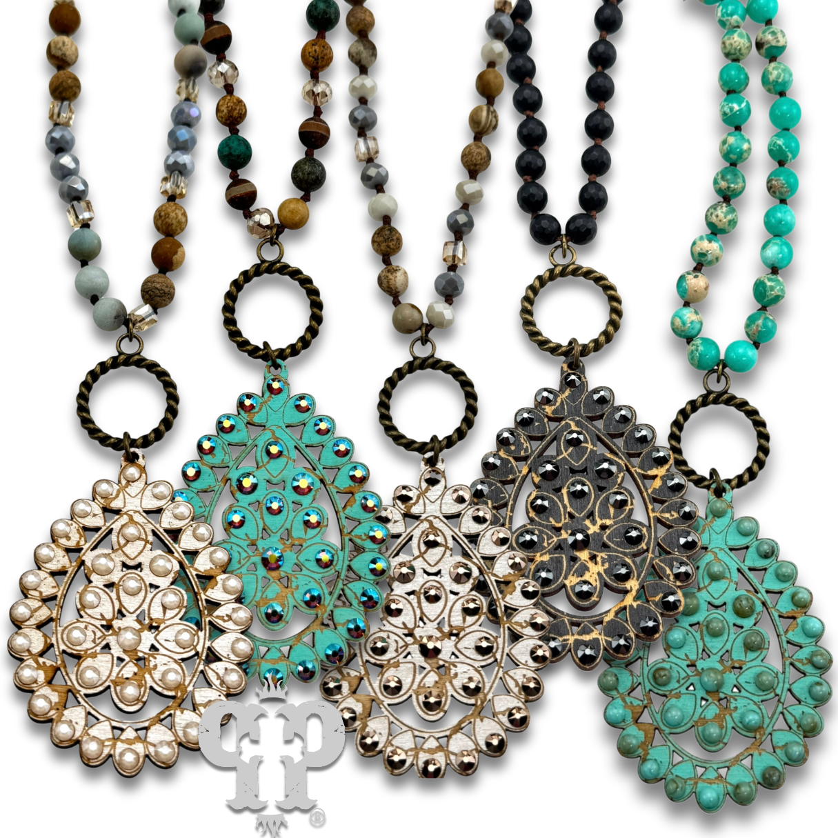 Elevate your wardrobe with this stunning Santa Fe teardrop necklace, where artisanal craftsmanship meets timeless elegance. The hand-set Austrian crystals catch light beautifully across the laser-cut wood pendant, while the knotted stone bead strand adds texture and movement. Perfect for layering or wearing solo, this long necklace brings sophistication to any outfit.