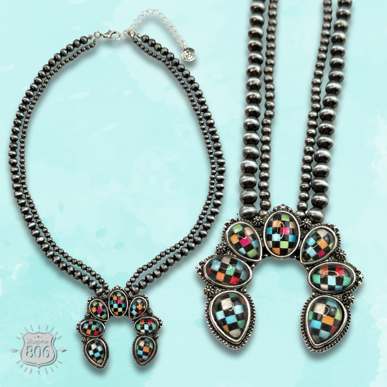 This necklace has two strands of silver tone burnished pearl beads. It features a checkerboard naja pendant.