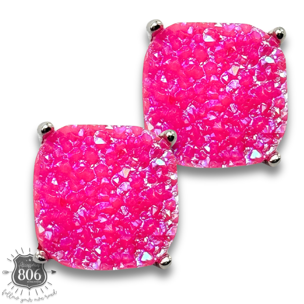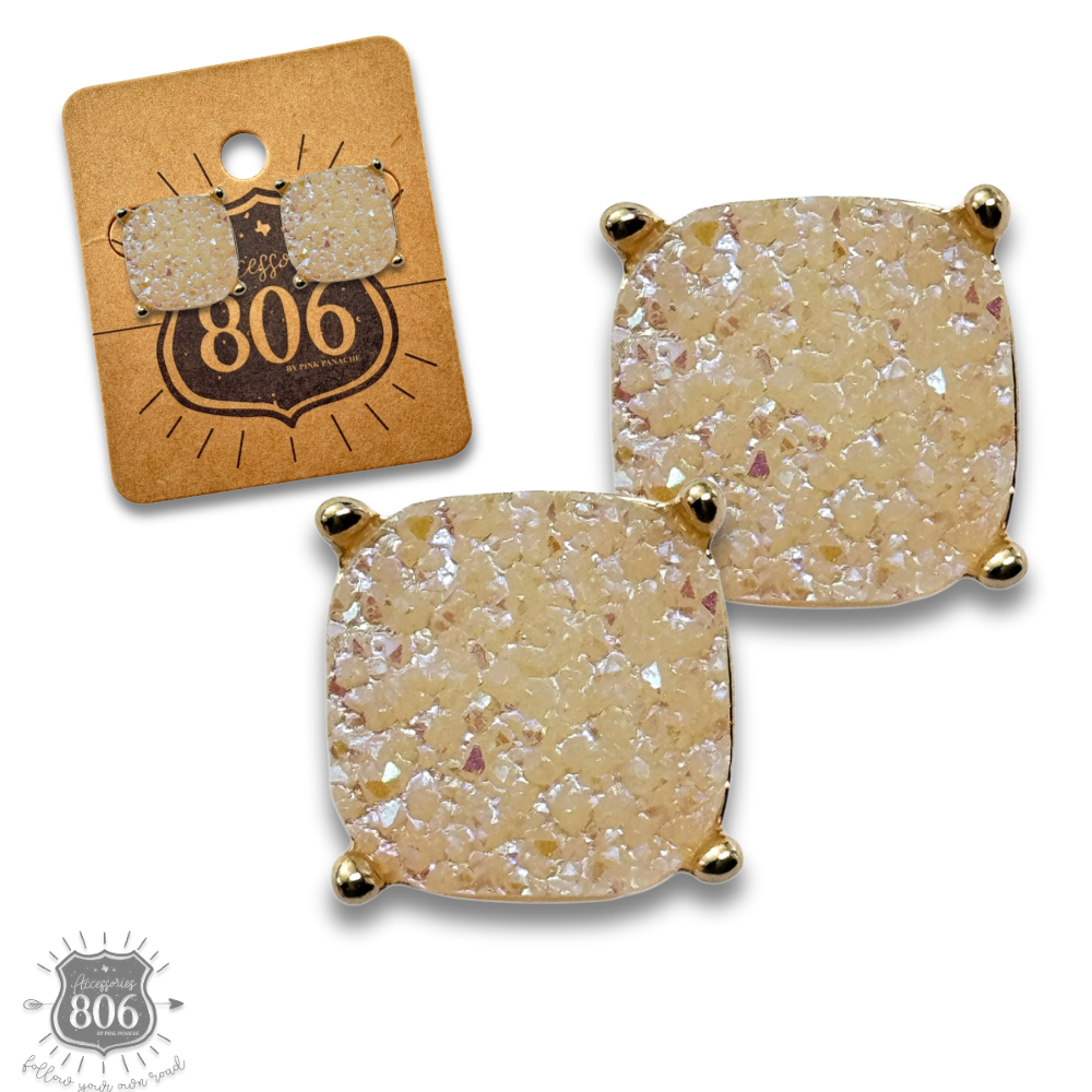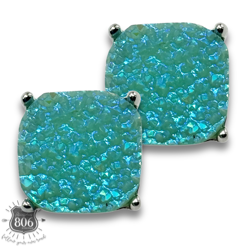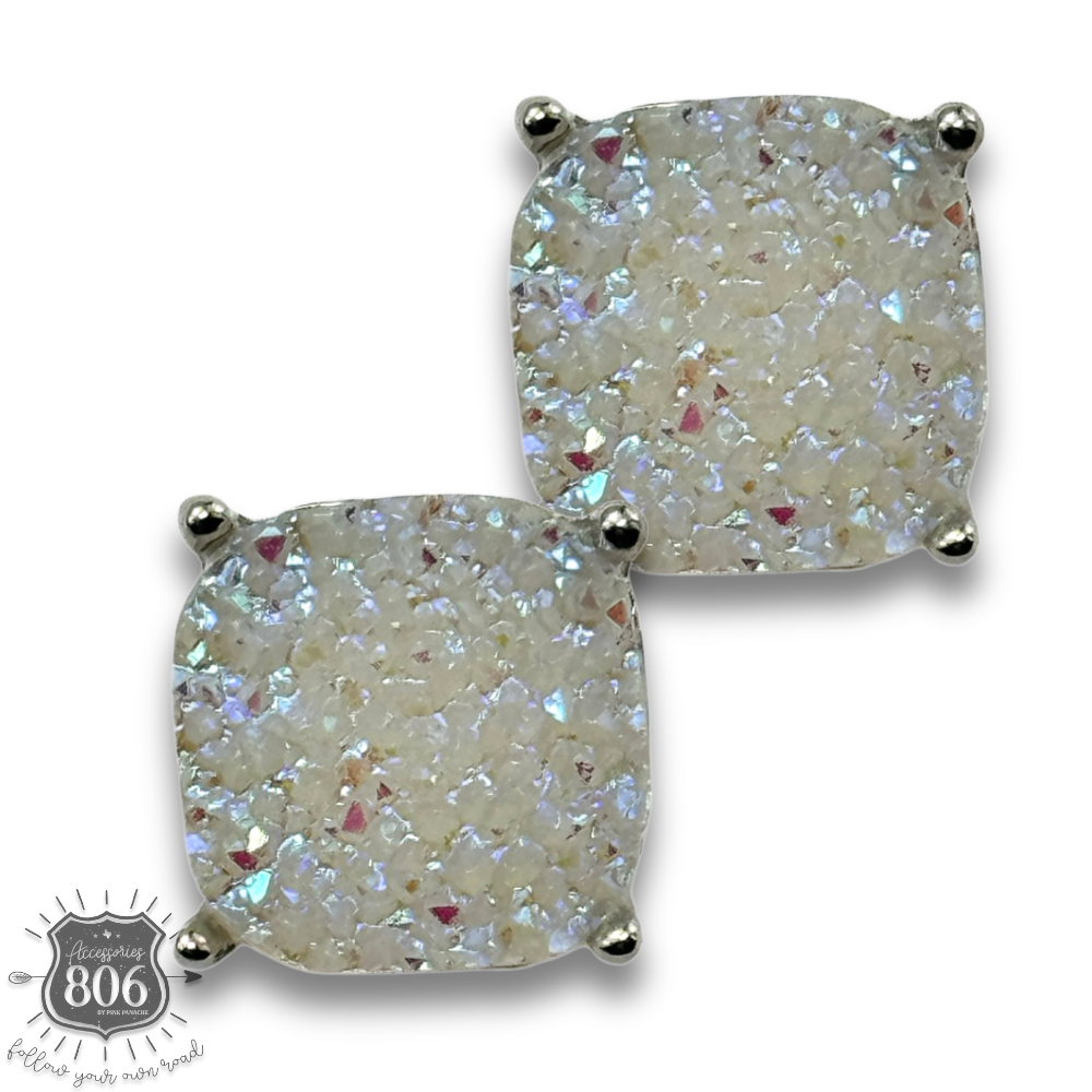 Lightweight acrylic druzy posts that catch the light with every movement. Choose between gold or cool silver tones to match your style. The iridescent faux druzy surface sparkles with color-shifting brilliance, creating eye-catching dimension without the weight of traditional stone. Perfect for all-day wear and effortless style.
