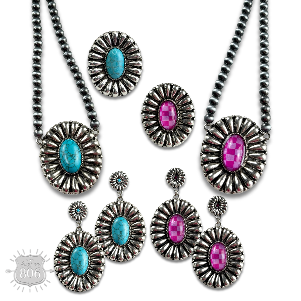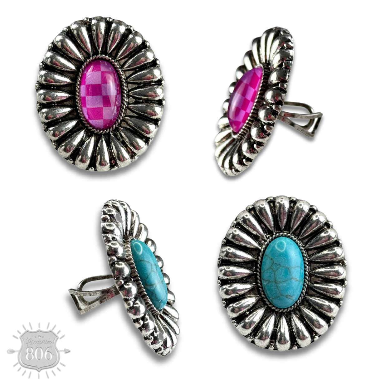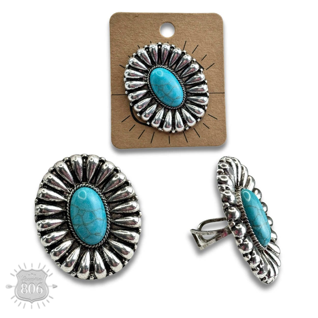 This adjustable base ring has a beautiful silver tone sunburst oval with an inlay center. The adjustable base makes it easy to wear.