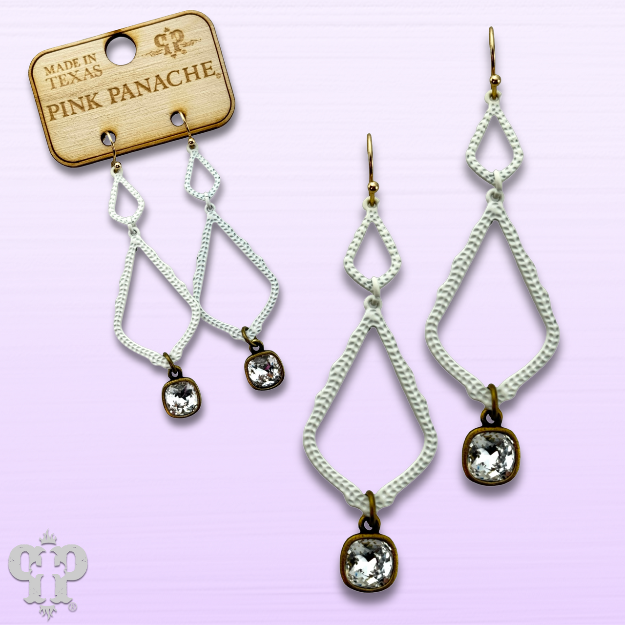 This teardrop earring two white diamond teardrops.  It has an 8mm clear Austrian crystal in a setting custom made for Pink Panache in the USA.