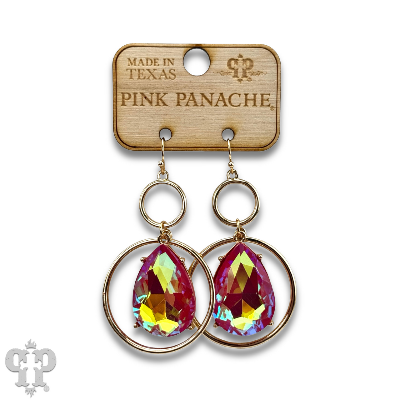 This earring has a large iridescent pink rhinestone teardrop inside a gold tone double circle earring.