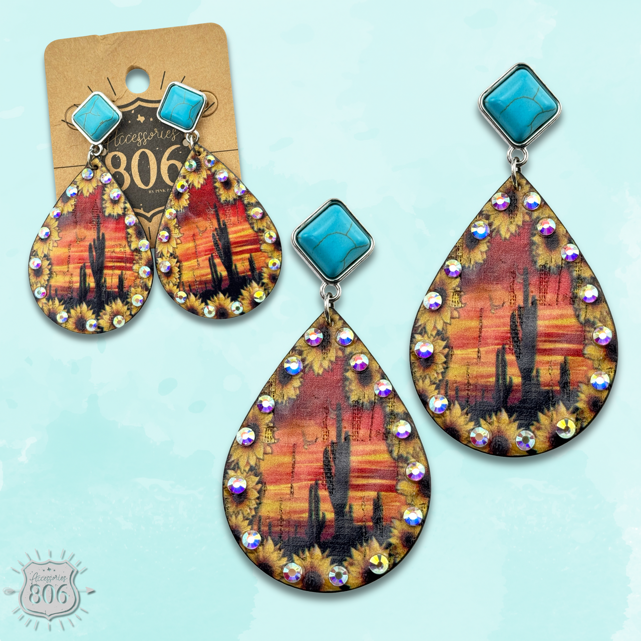 Spruce up your desert vibe with these teardrop earrings featuring shimmery rhinestones and a turquoise colored stone.