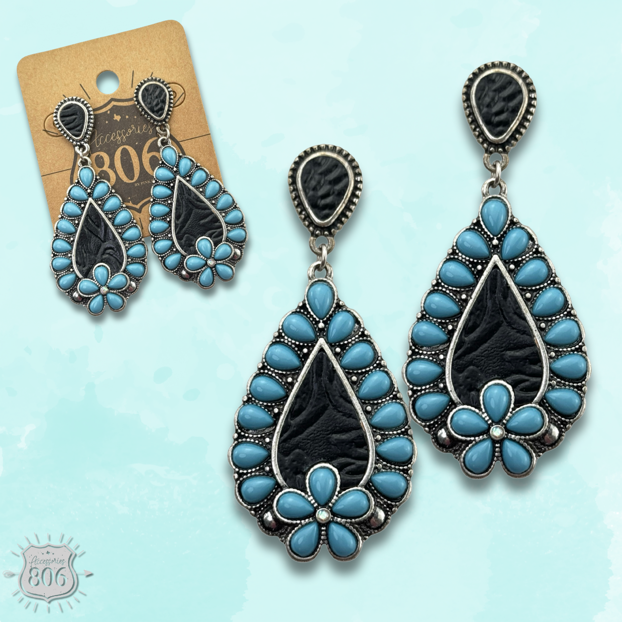 Teardrop earring with tooled look inlay on teardrop post setting. Approximately 2.5 inches in length.