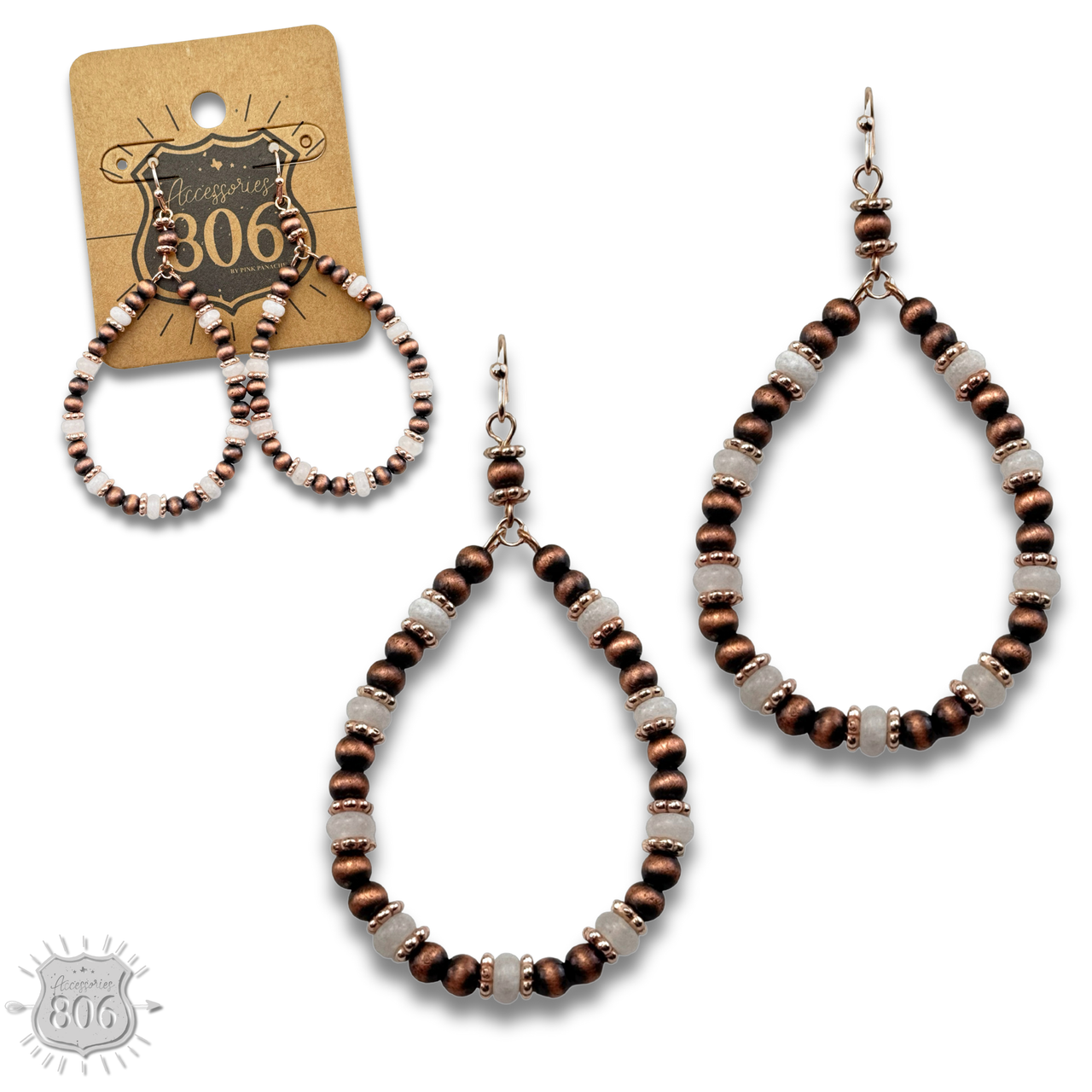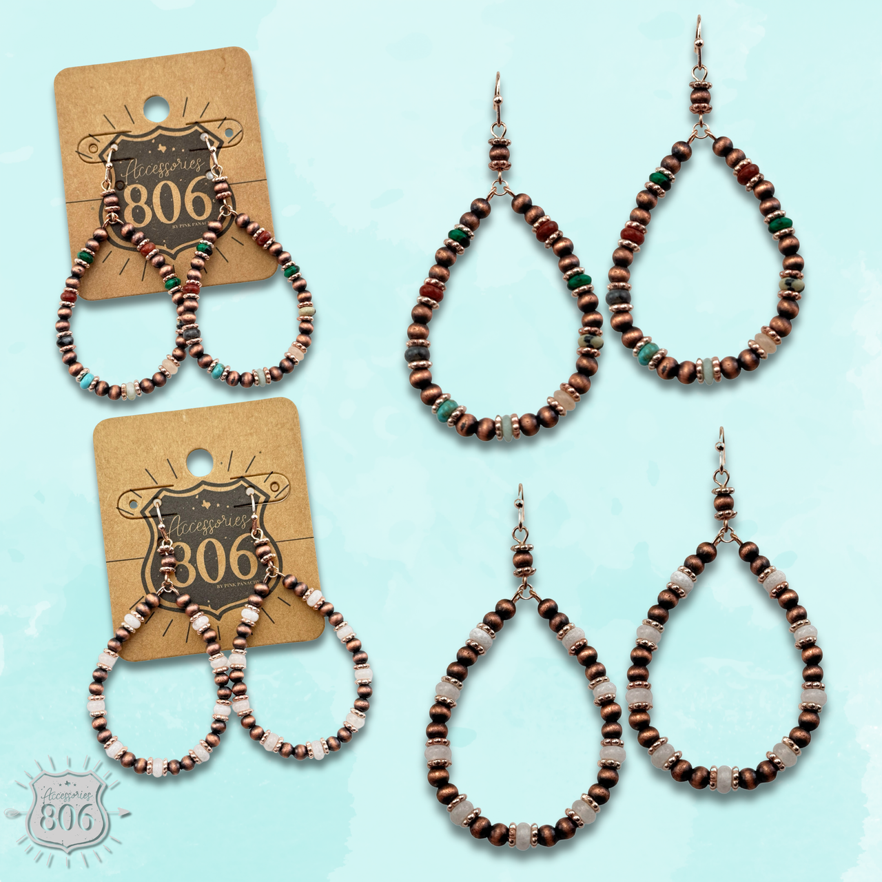 This teardrop shape earring has copper burnished beads along with stone beads on a french hook.