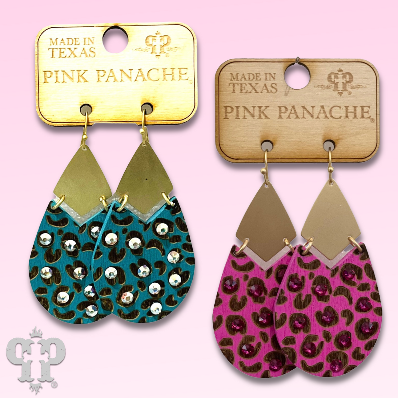 This earring has an animal print wood teardrop with hand set fuchsia Austrian crystals.