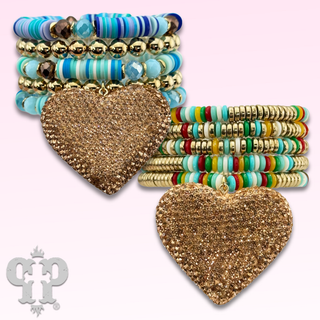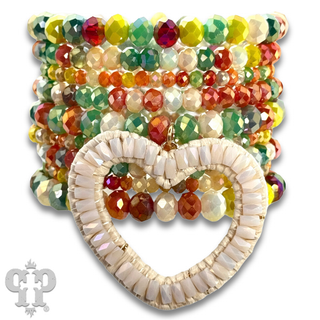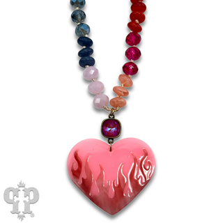 Multi-color bead necklace with large heart charm and Austrian crystal