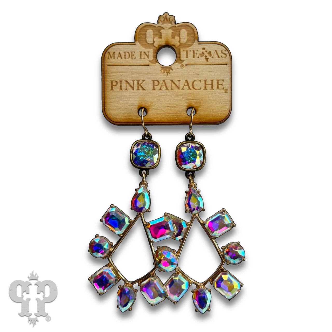 This earring features multi-shaped rhinestones in a chandelier teardrop shape.  It hangs from a 10mm Austrian crystal in a setting custom made for Pink Panache in the USA.