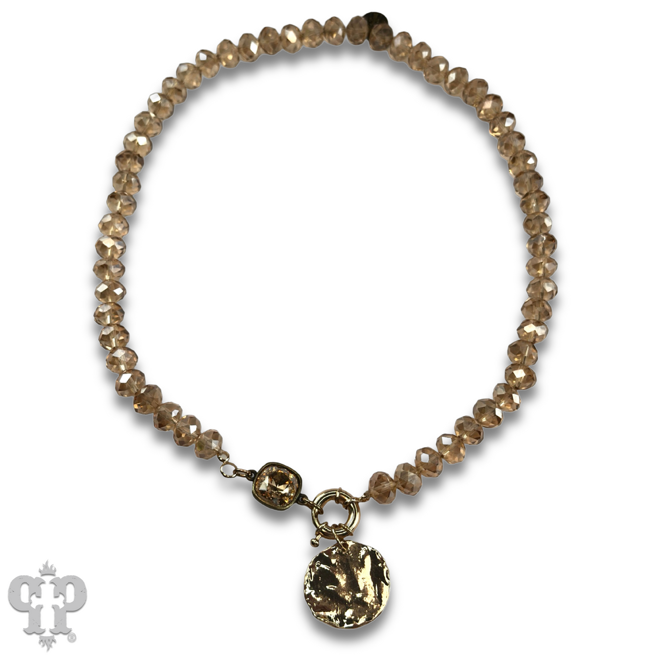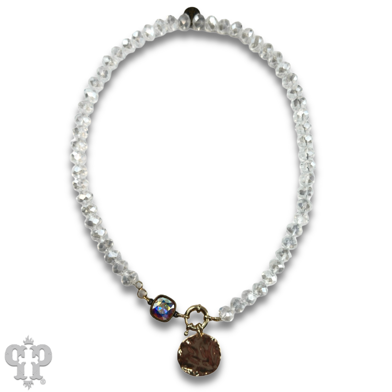 This crystal bead necklace features a spring clasp and gold disc pendant.  Connecting the pendant and necklace is a 12mm Austrian crystal connector in a setting custom made for Pink Panache in the USA.  Approximately 16 inches in length and spring clasp is in the front.