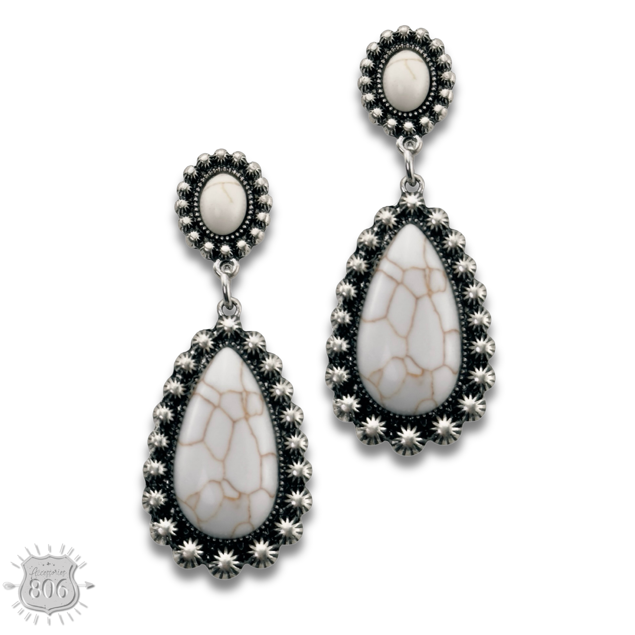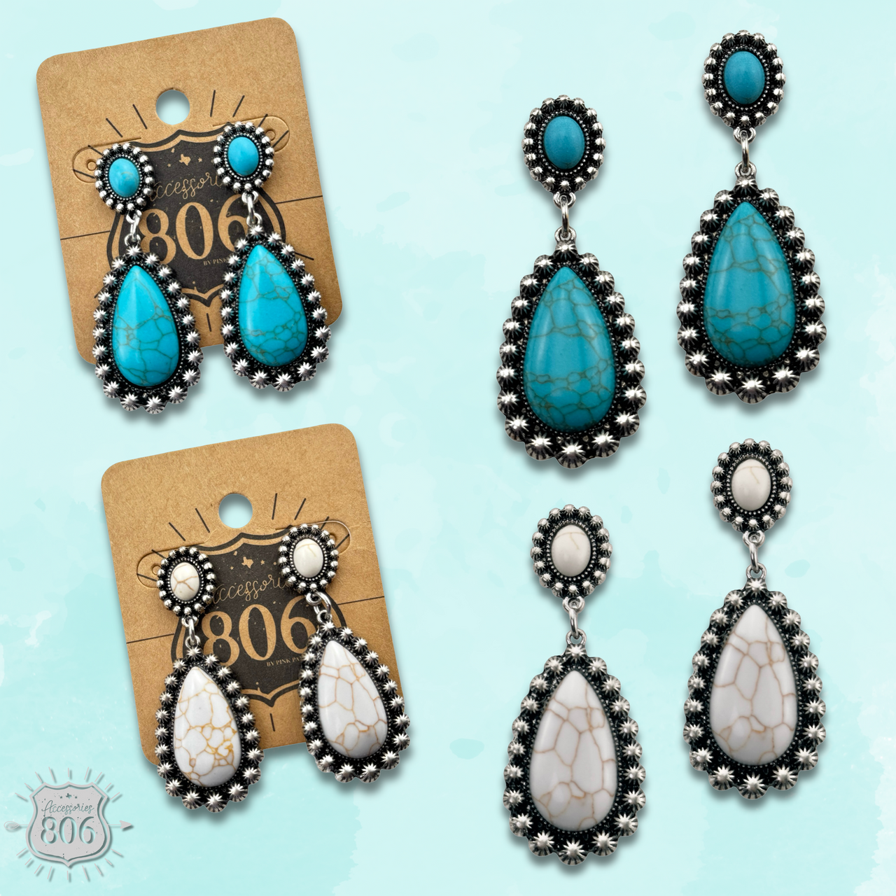 These earrings feature a colorful teardrop stone in a studded silver color setting on a studded post setting.