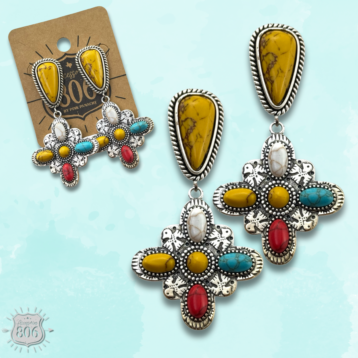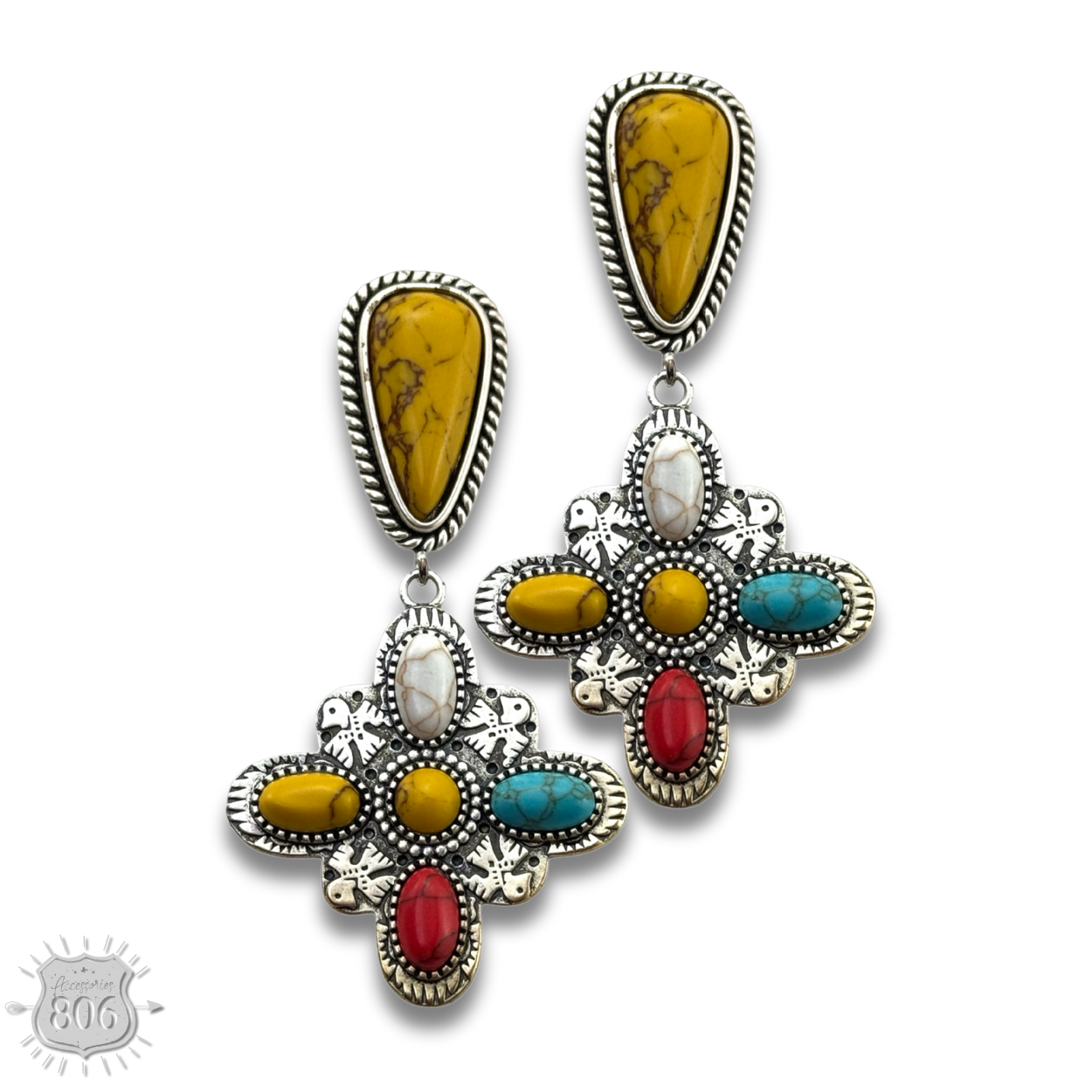 This earring boasts a stone that's flipped on its head like a teardrop.  The charm is a four point cross with mixed color stones and thunderbird features.