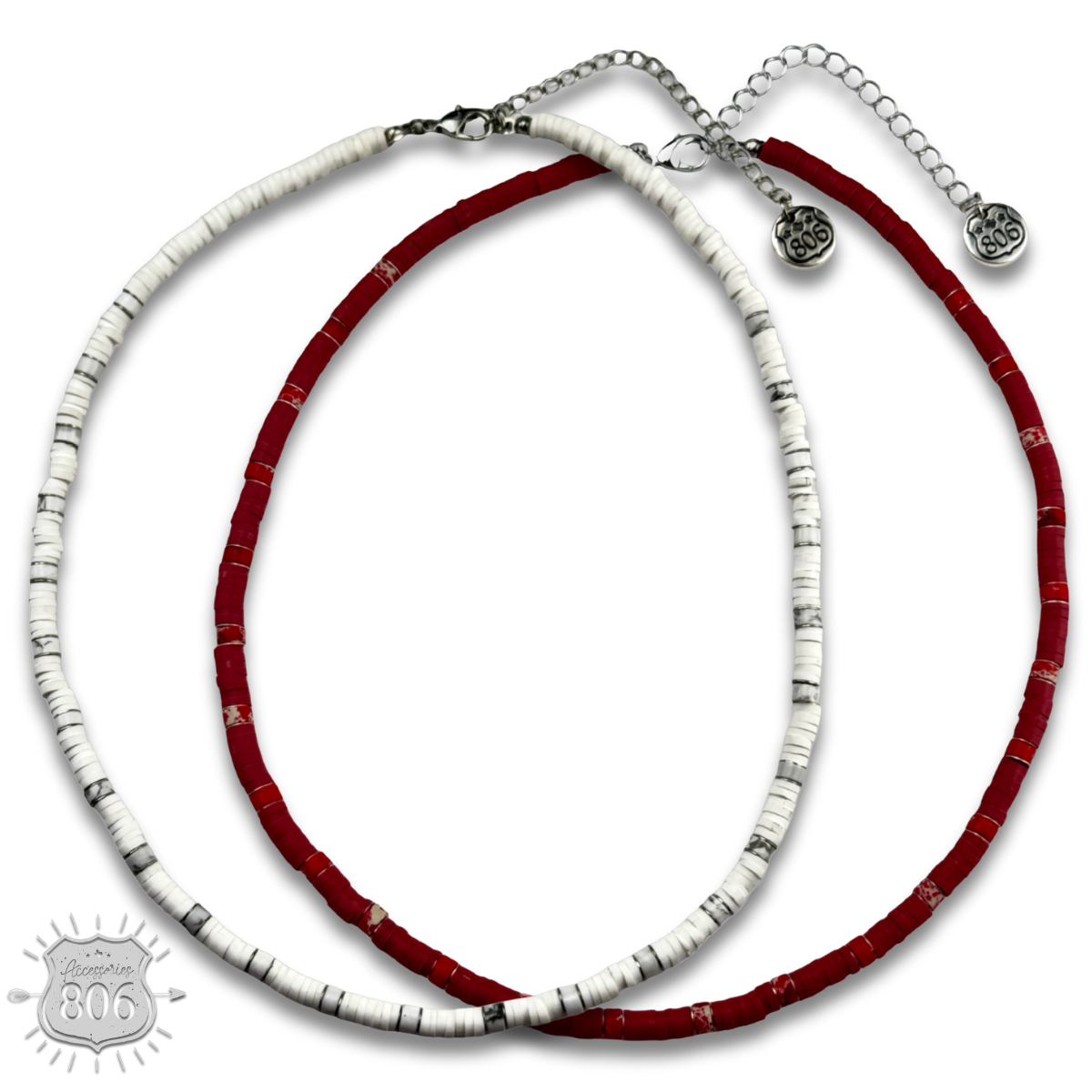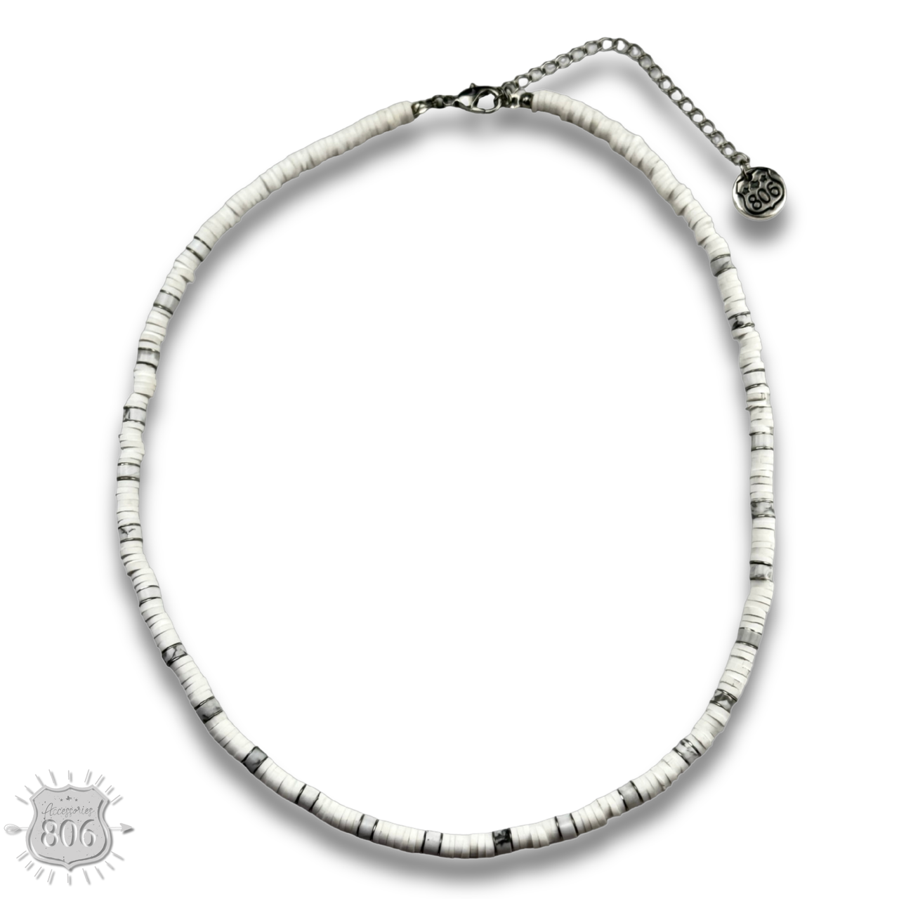 This necklace is made with rubber disc beads with some silver tone beads mixed in.