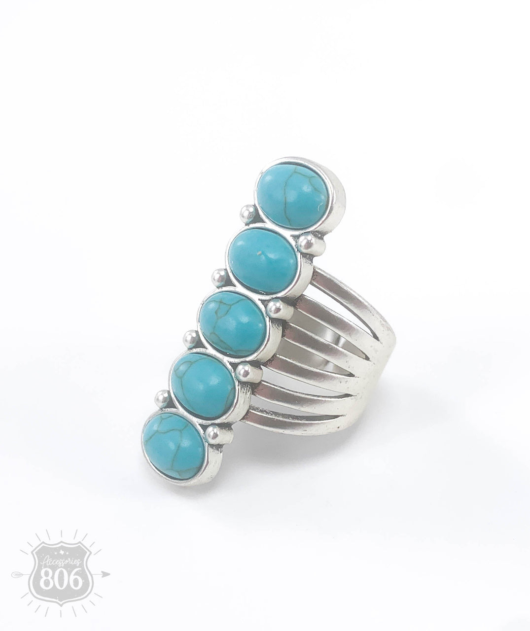 This ring has five vertical stones on a silver base and is adjustable.