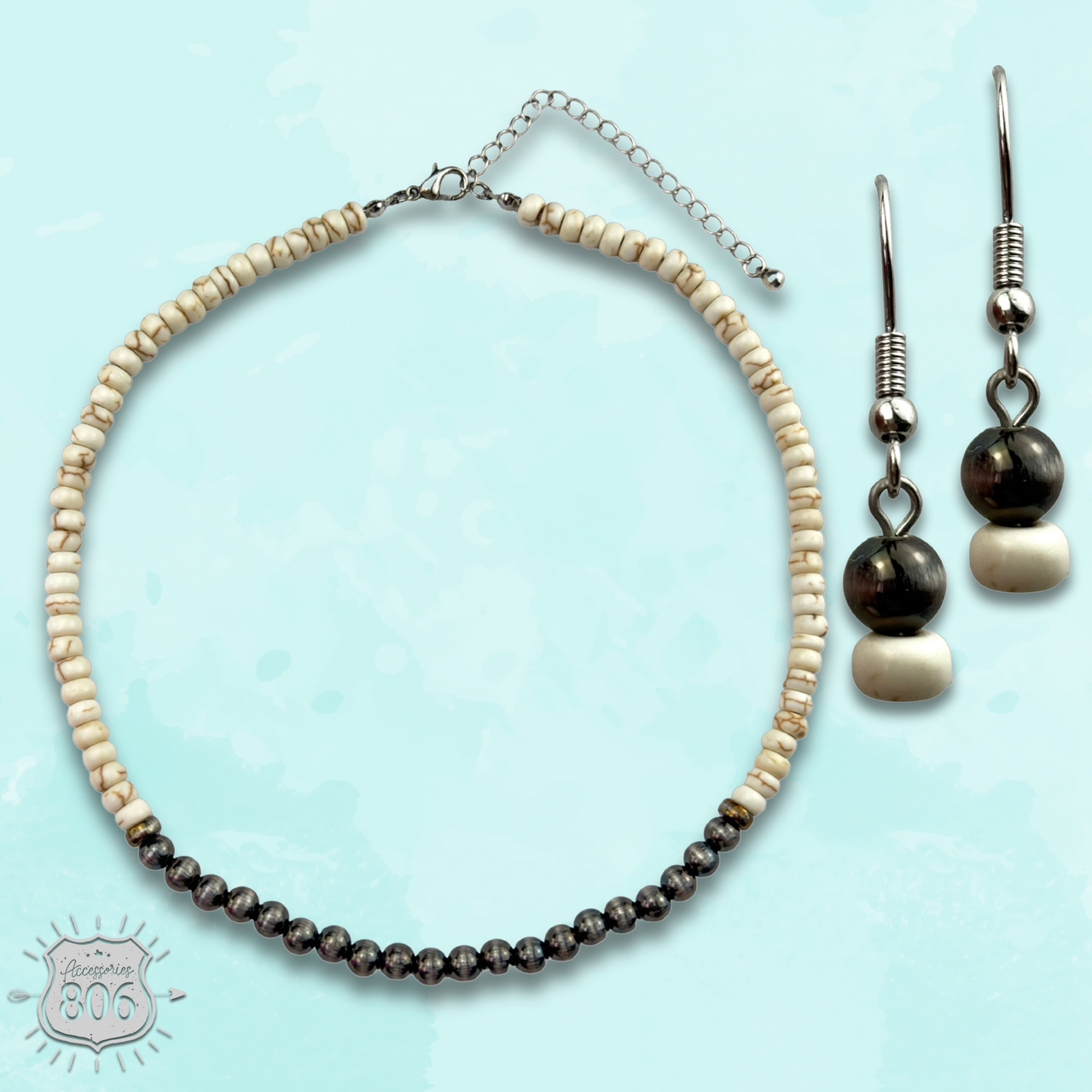 This set includes burnished silver color and stone bead necklace and a pair of matching bead drop earrings.