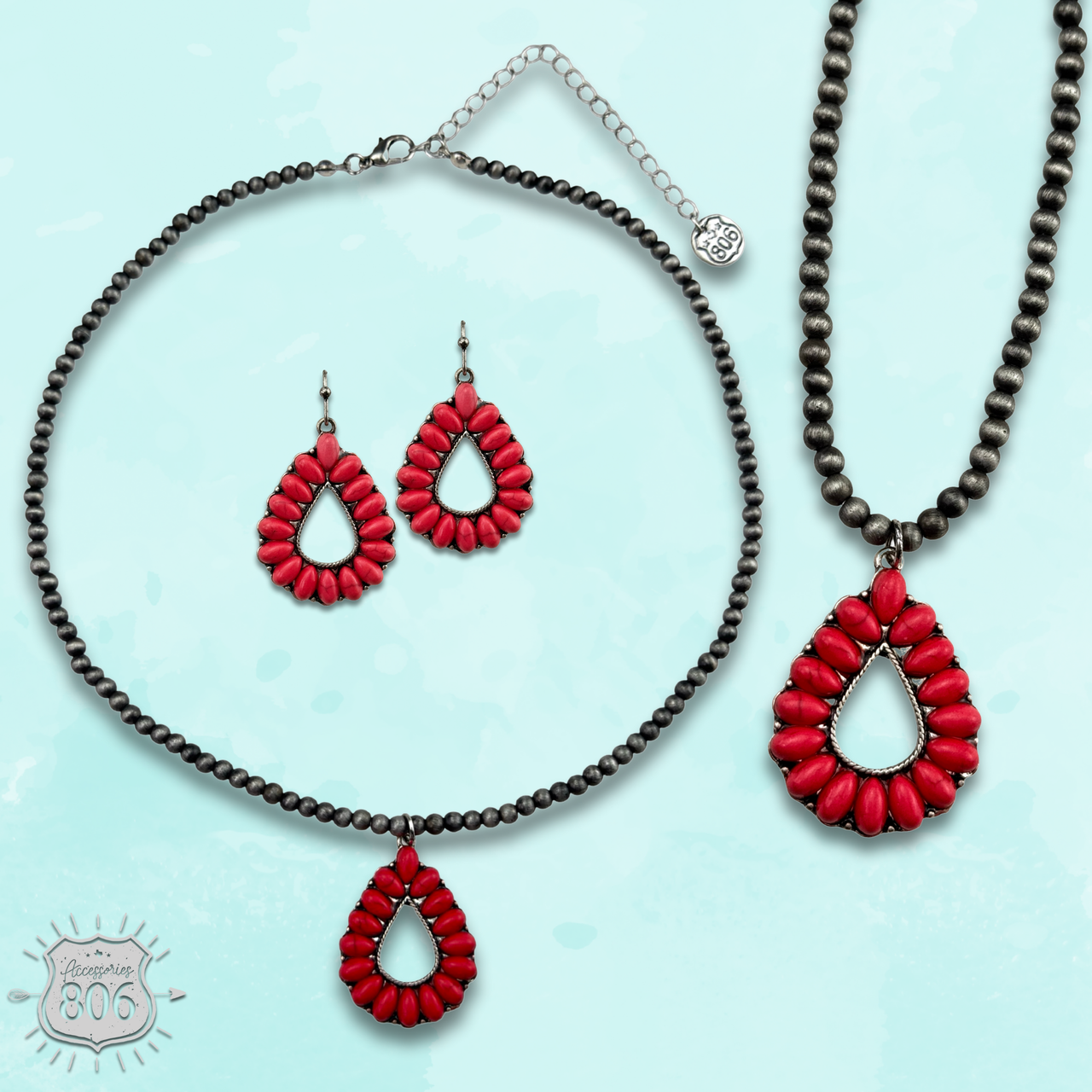 This set includes a burnished silver bead necklace with a stone teardrop pendant and a pair of matching stone teardrop earrings.