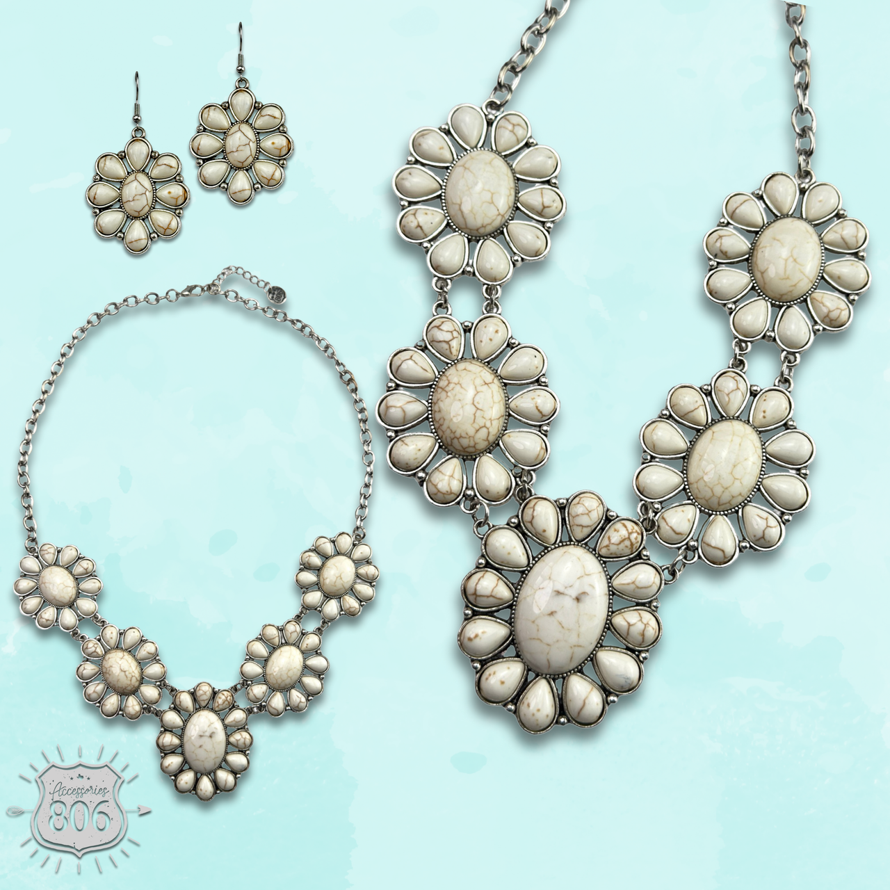 This set includes a white stone flower necklace with matching white stone flower earrings.  The earrings are on a french hook.