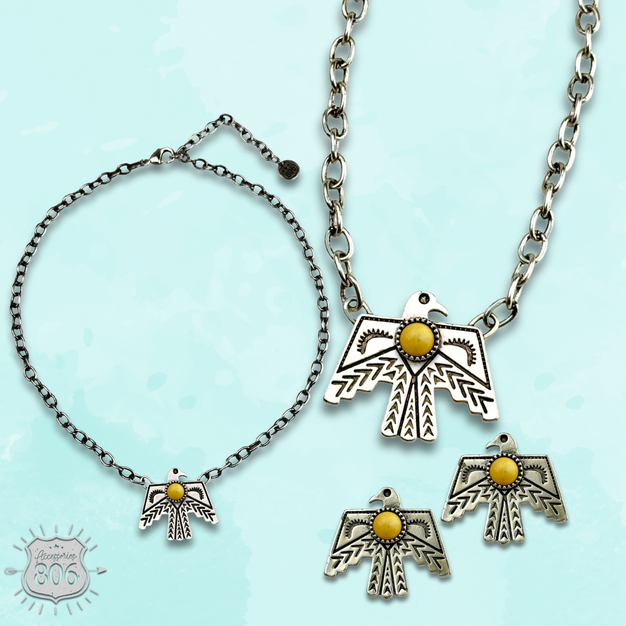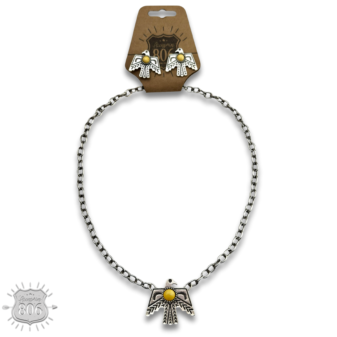This set includes a silver tone thunderbird pendant on chain with embedded stone bead. The set has matching thunderbird post earrings.