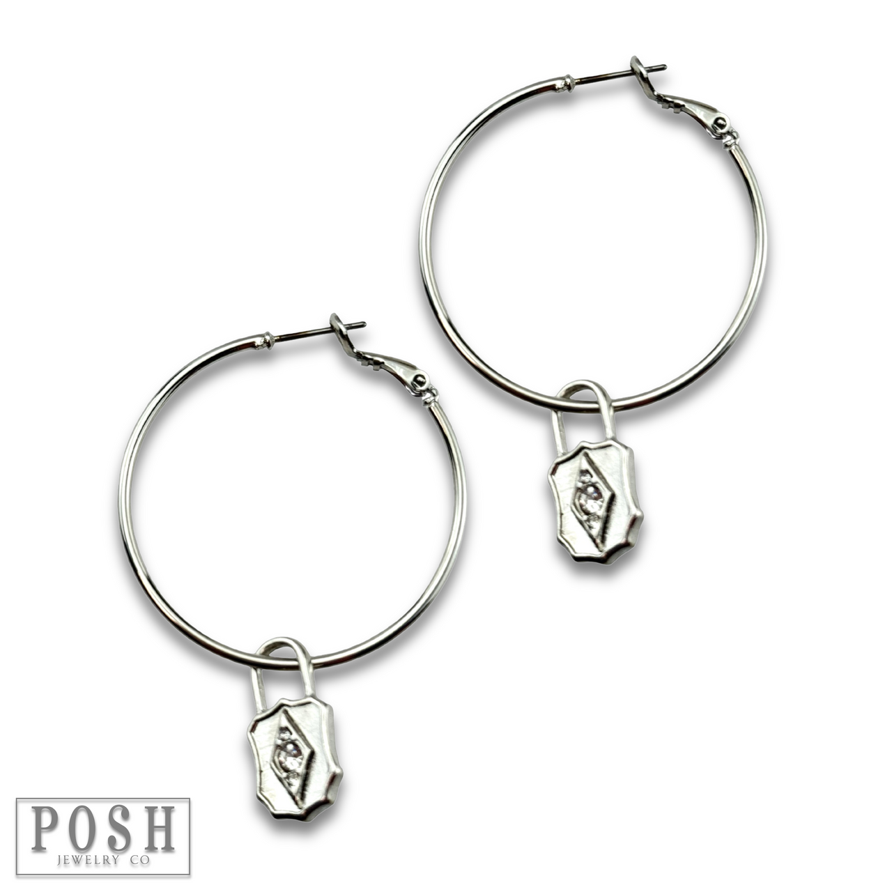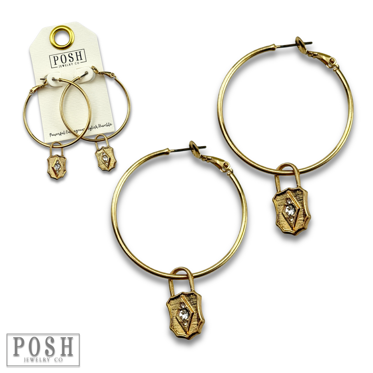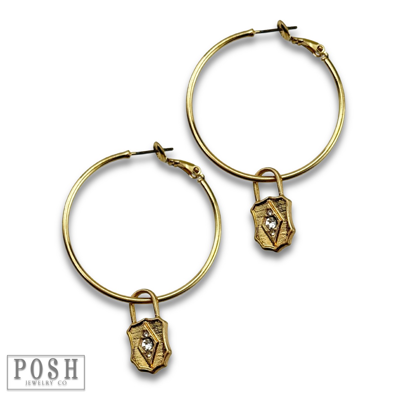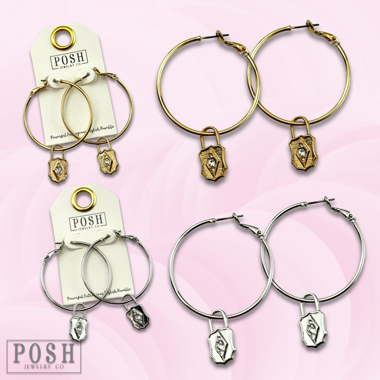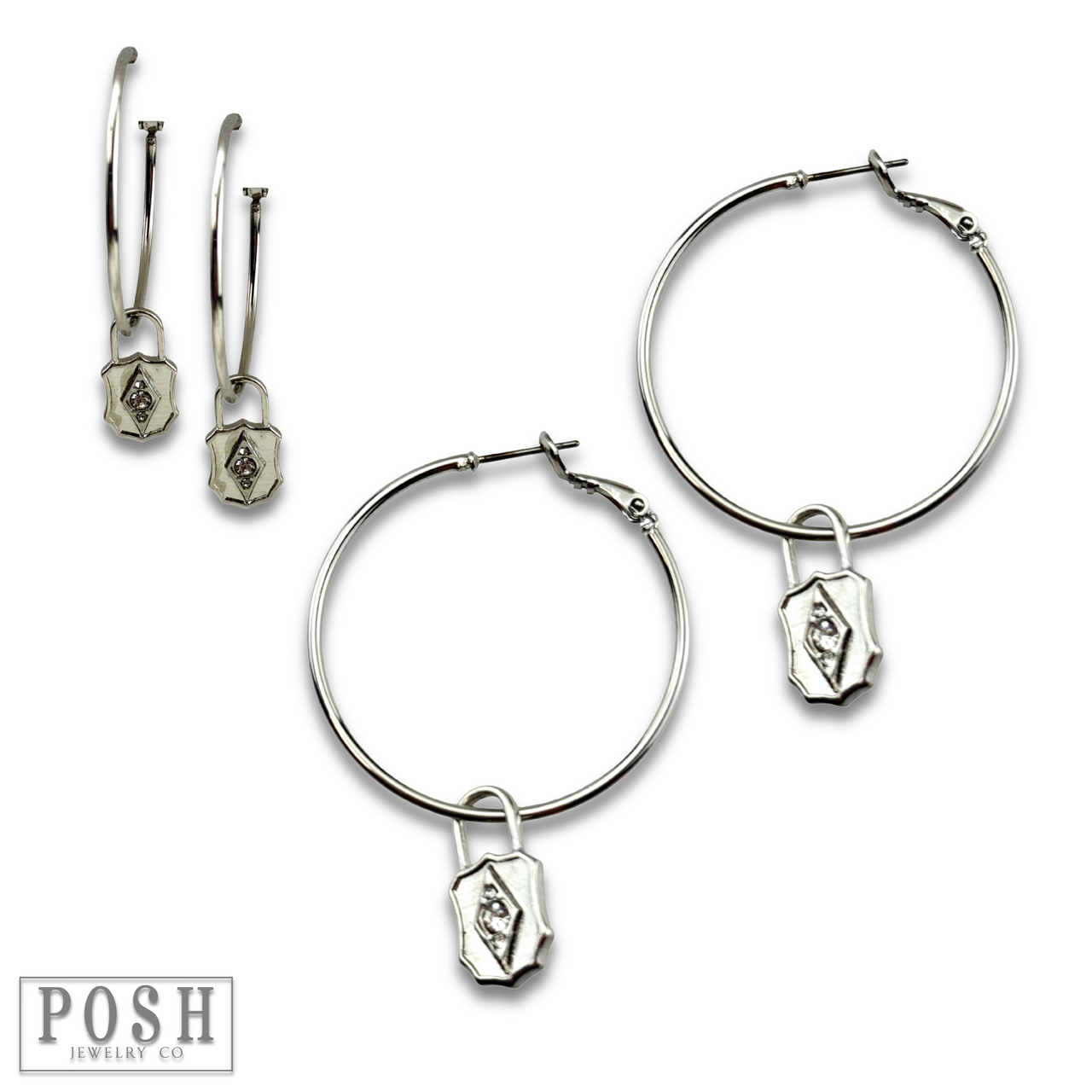 These earrings are like a game of hoops, with a sparkly rhinestone lock charm floating in the mix.