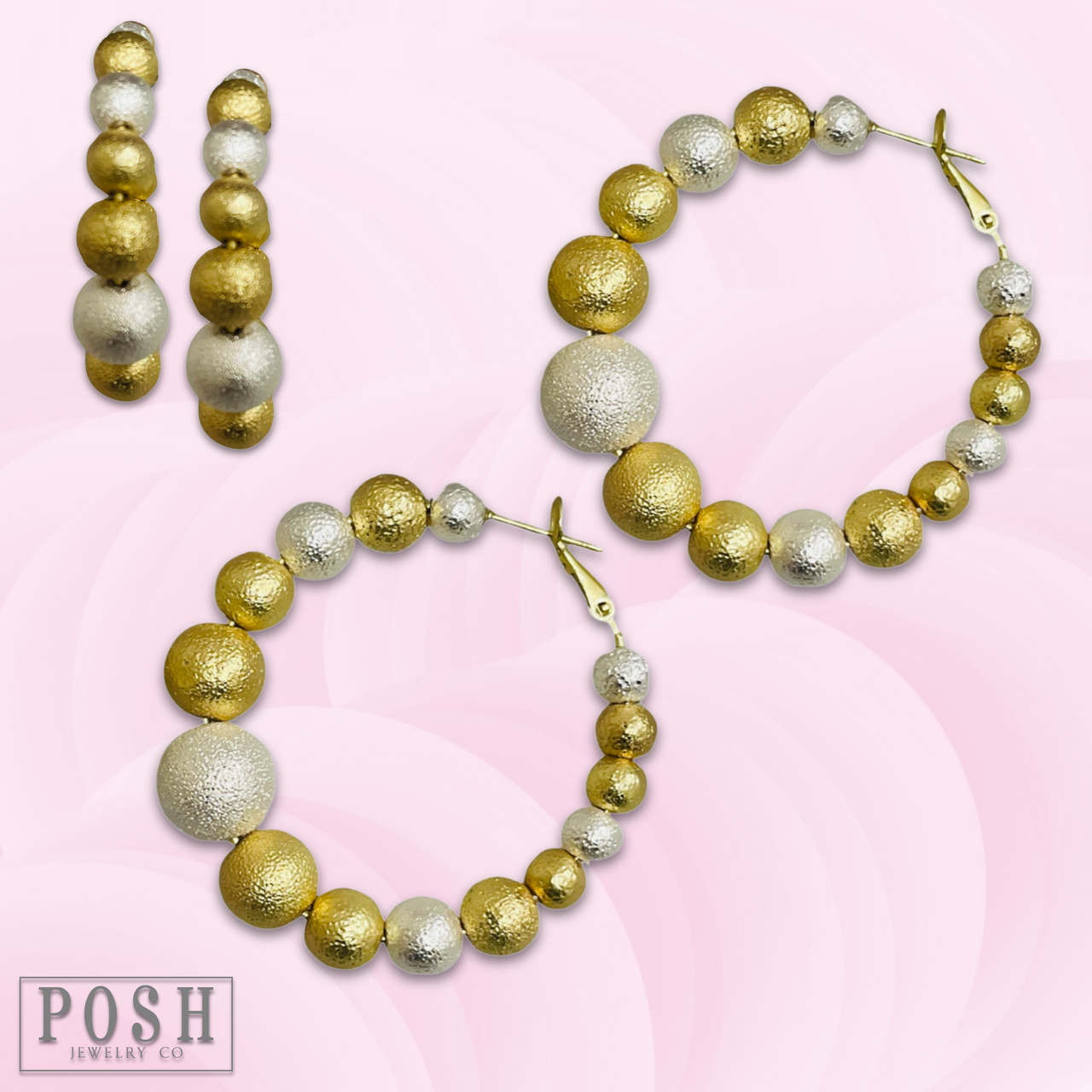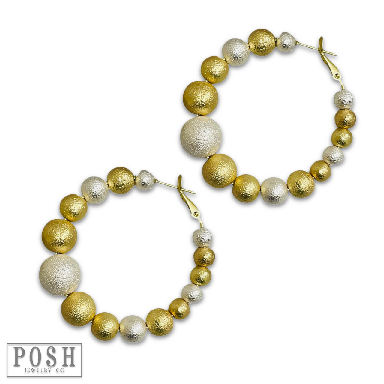 These hoop earrings feature graduated worn gold and silver beads.