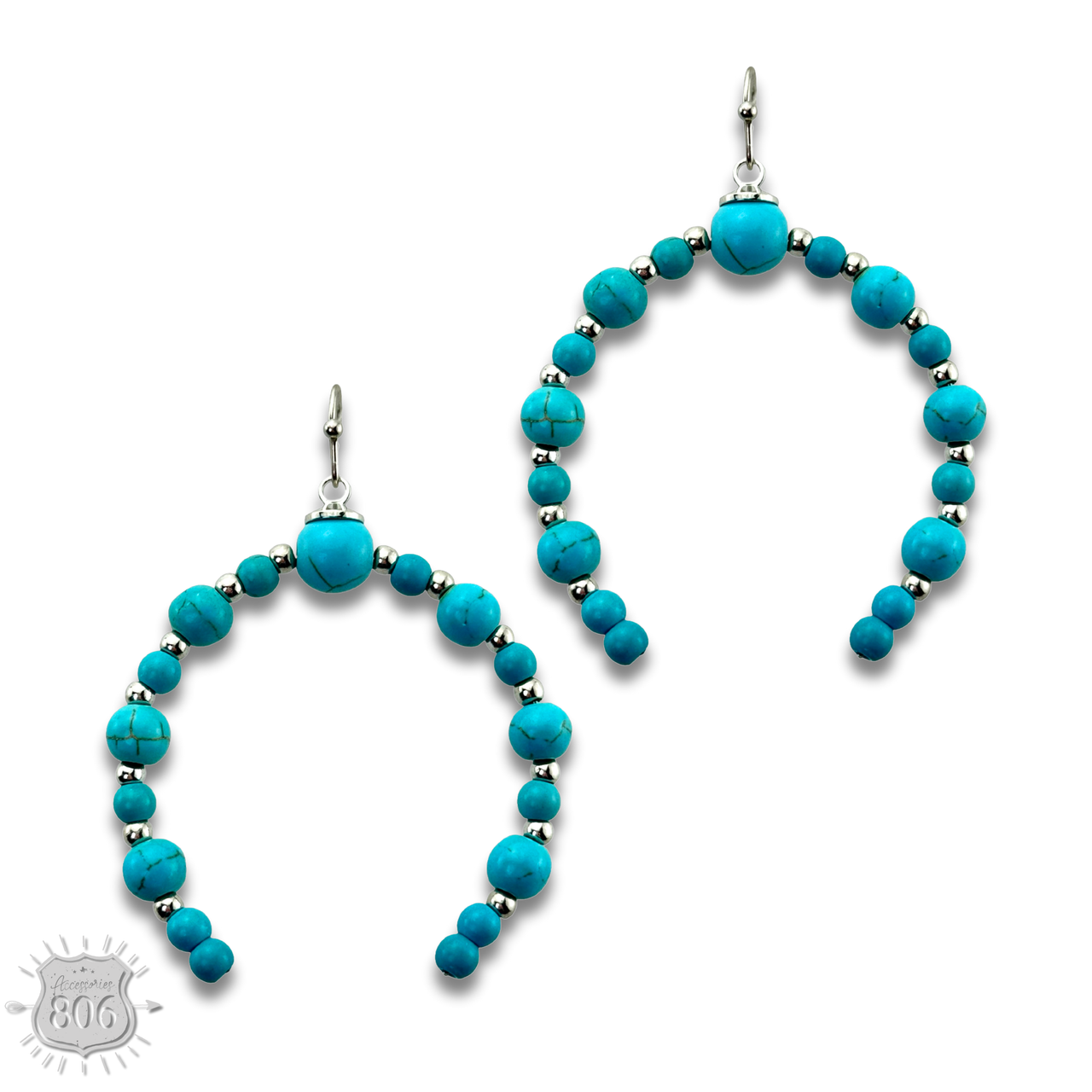 These horn earrings have an arched design and are adorned with round stone and silver color beads, all on a hook setting.