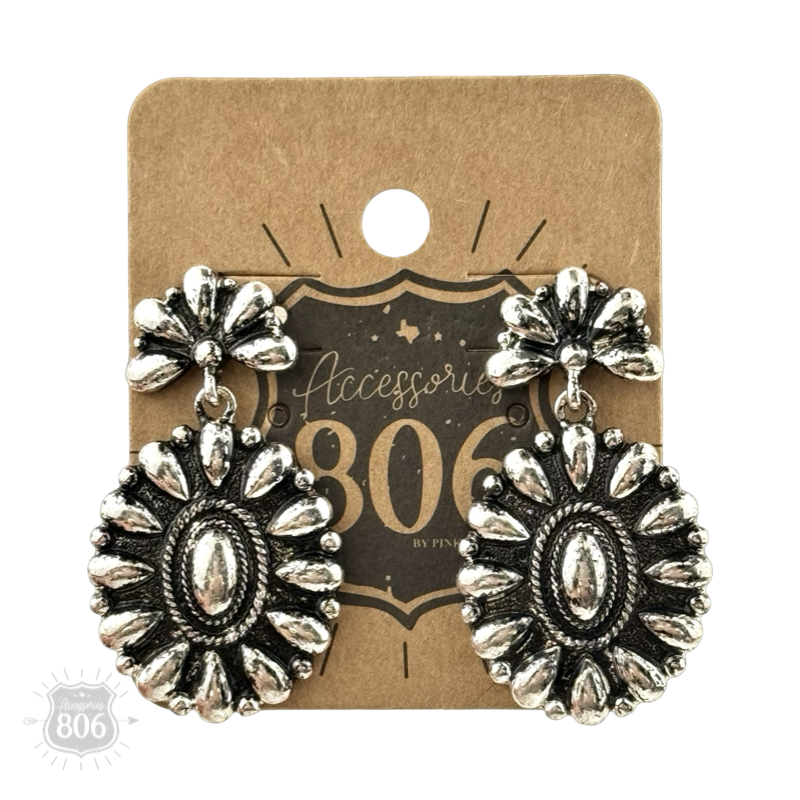This western style earring has a blossom cluster concho hanging from a decorative post.