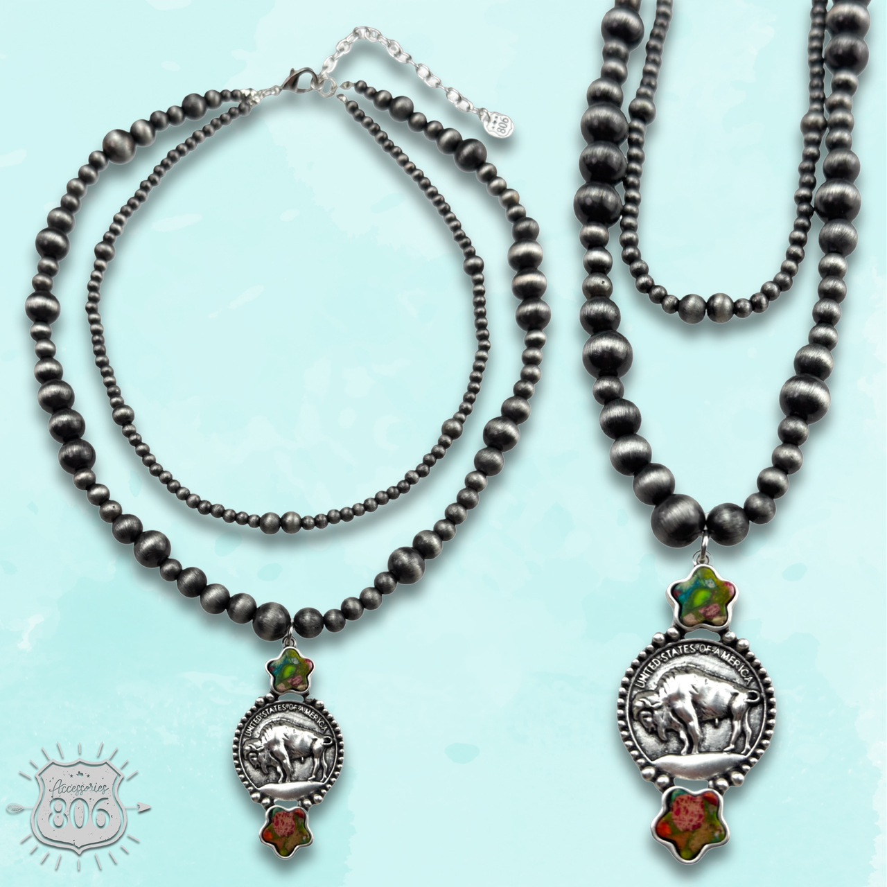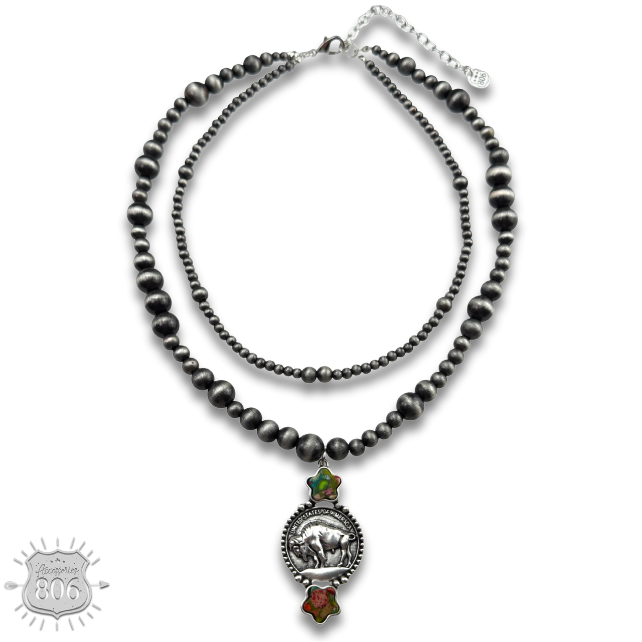 This two strand necklace features silver tone burnished beads with a buffalo nickel pendant inside a silver tone dotted setting with stone stars above and below it.