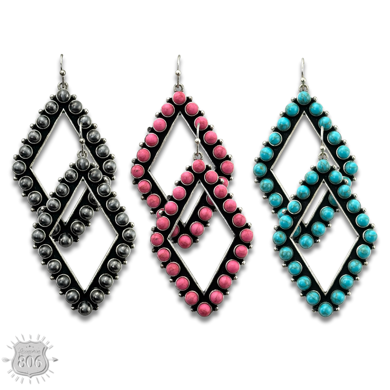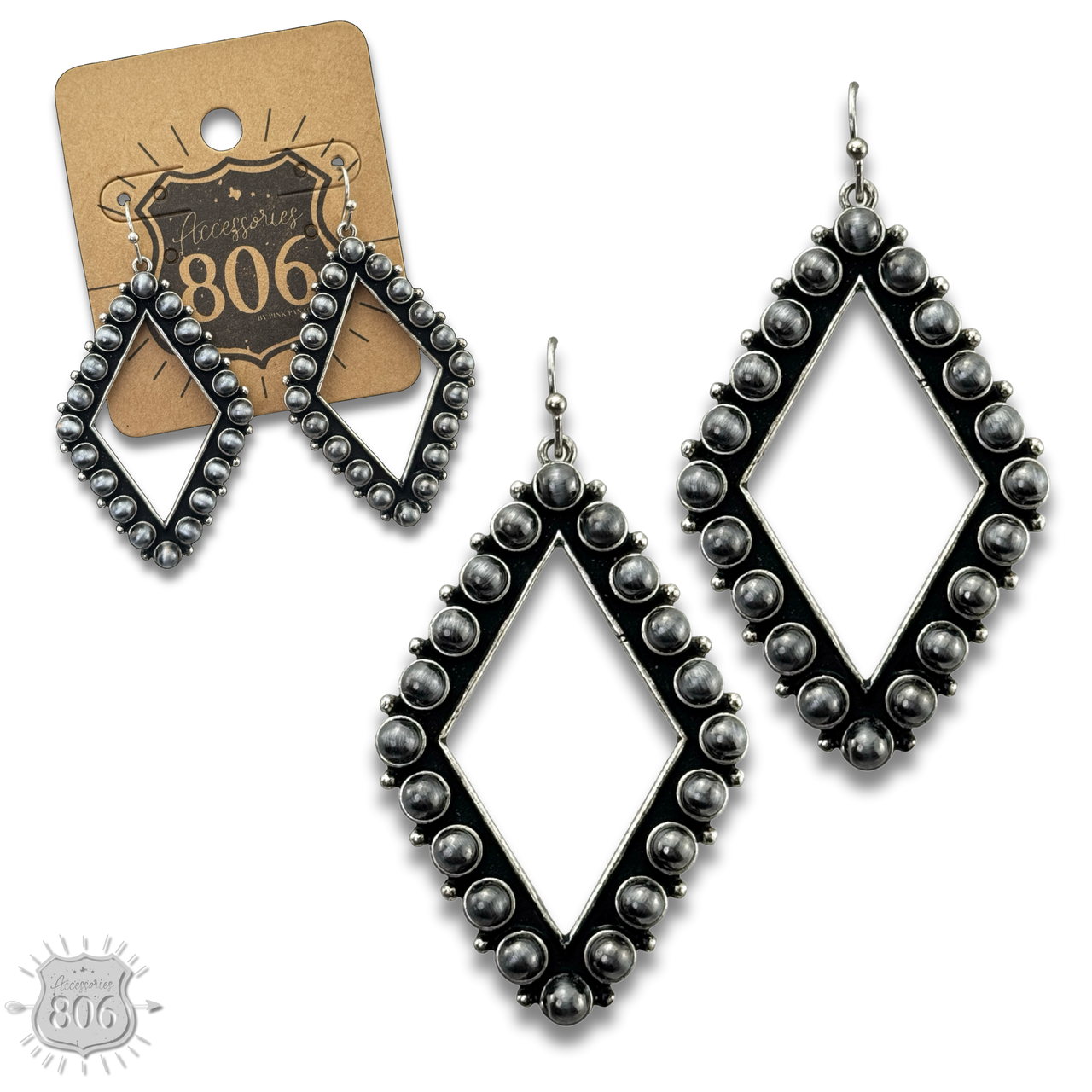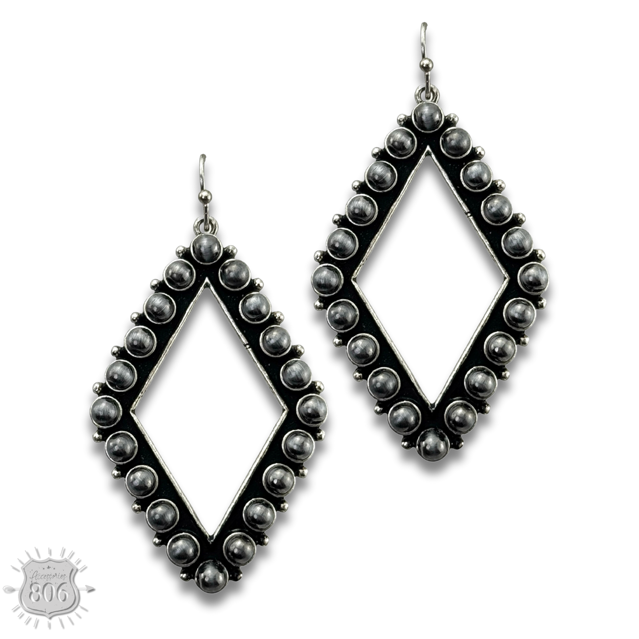 This burnished silver earring has an open diamond shape with bead studs around the rim on a french hook.