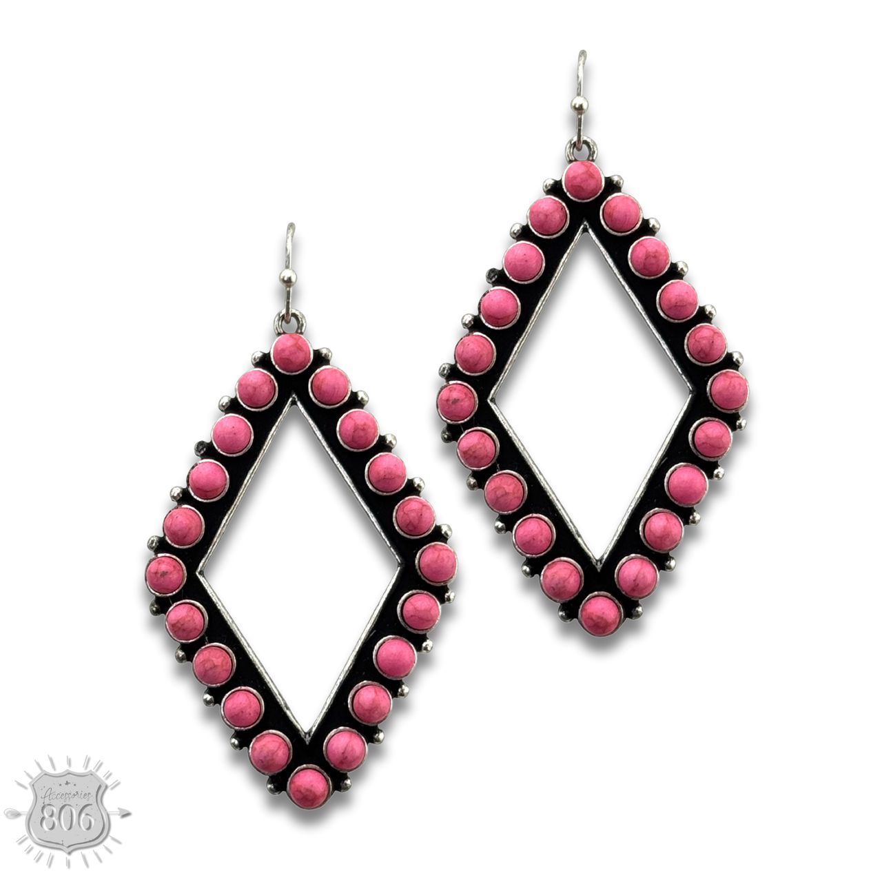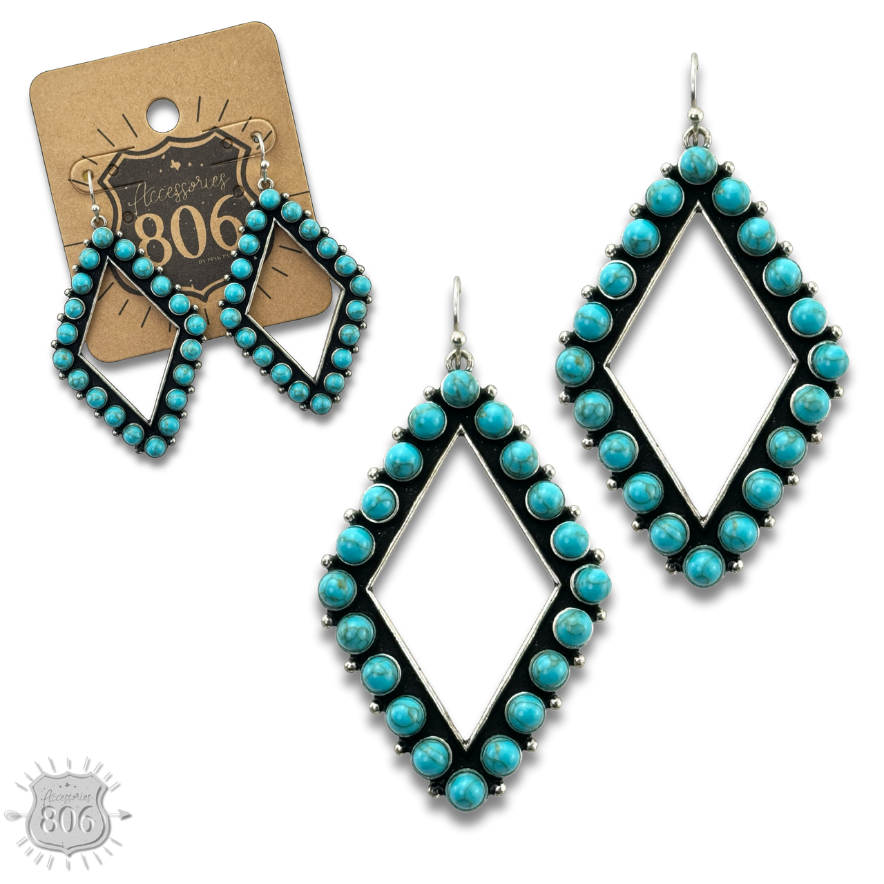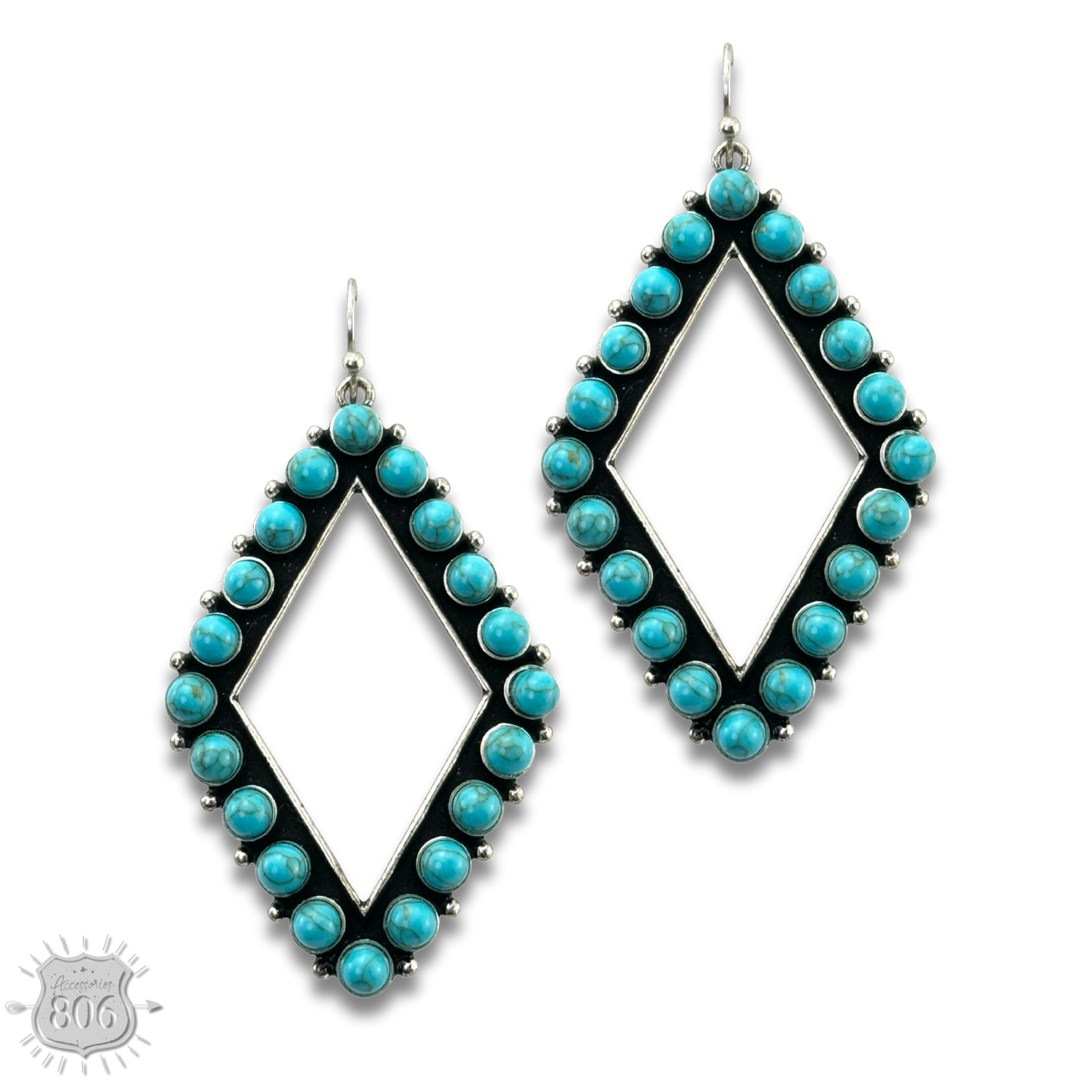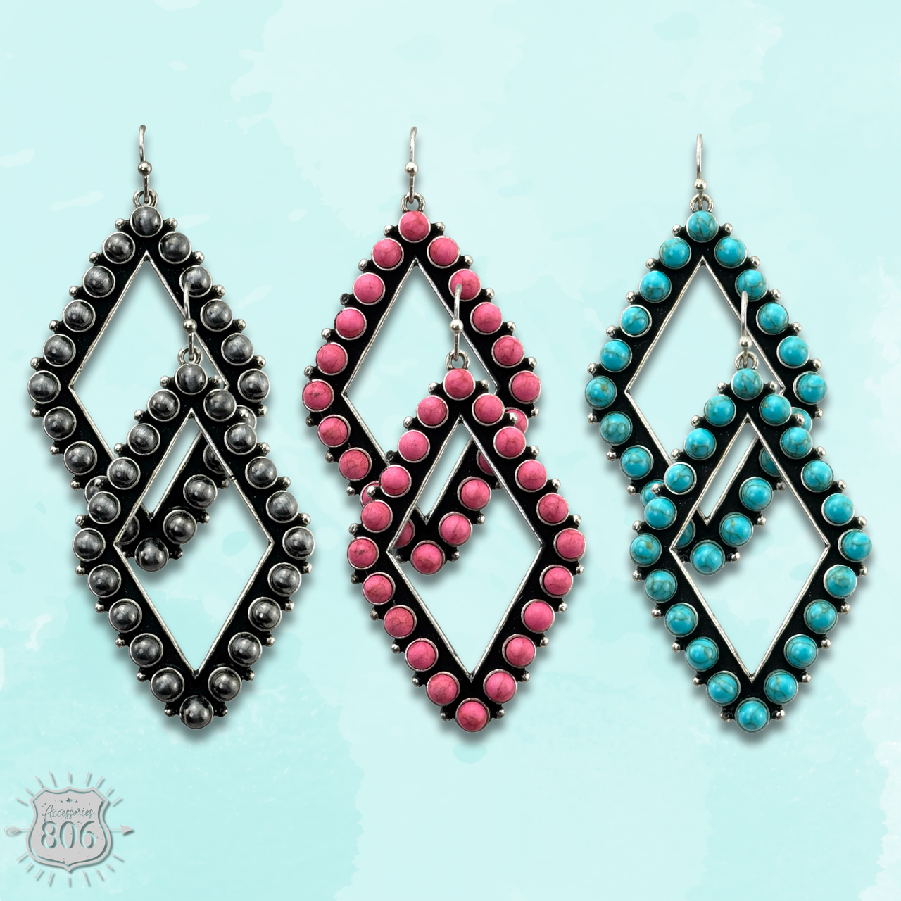 This burnished silver earring has an open diamond shape with bead studs around the rim on a french hook.