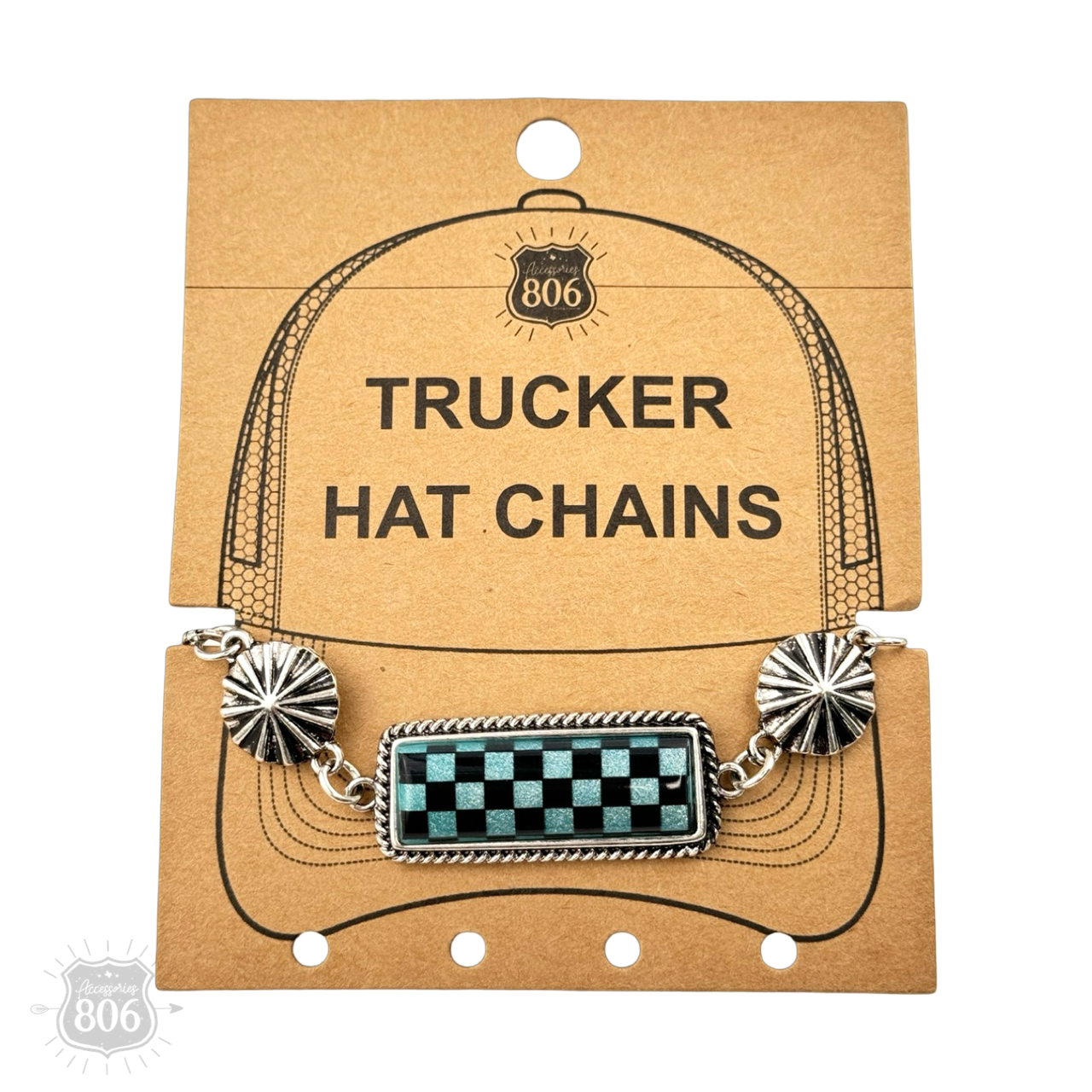 This trucker hat chain has a horizontal checkerboard center with two sunburst conchos on either side. Both features are on a silver tone chain.