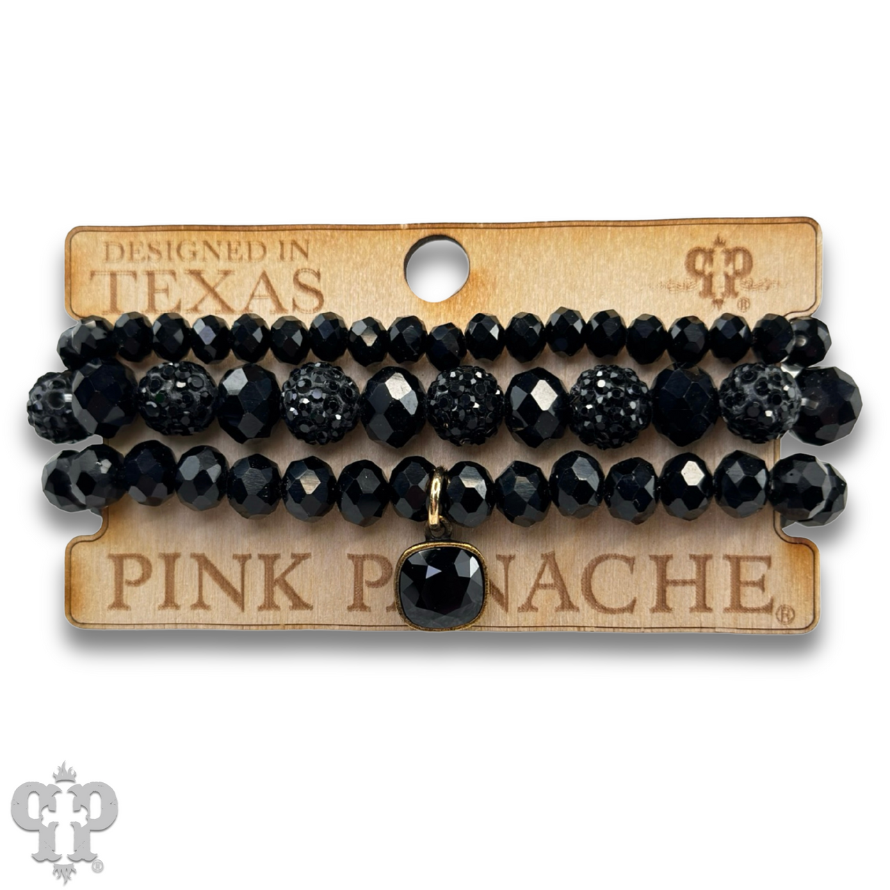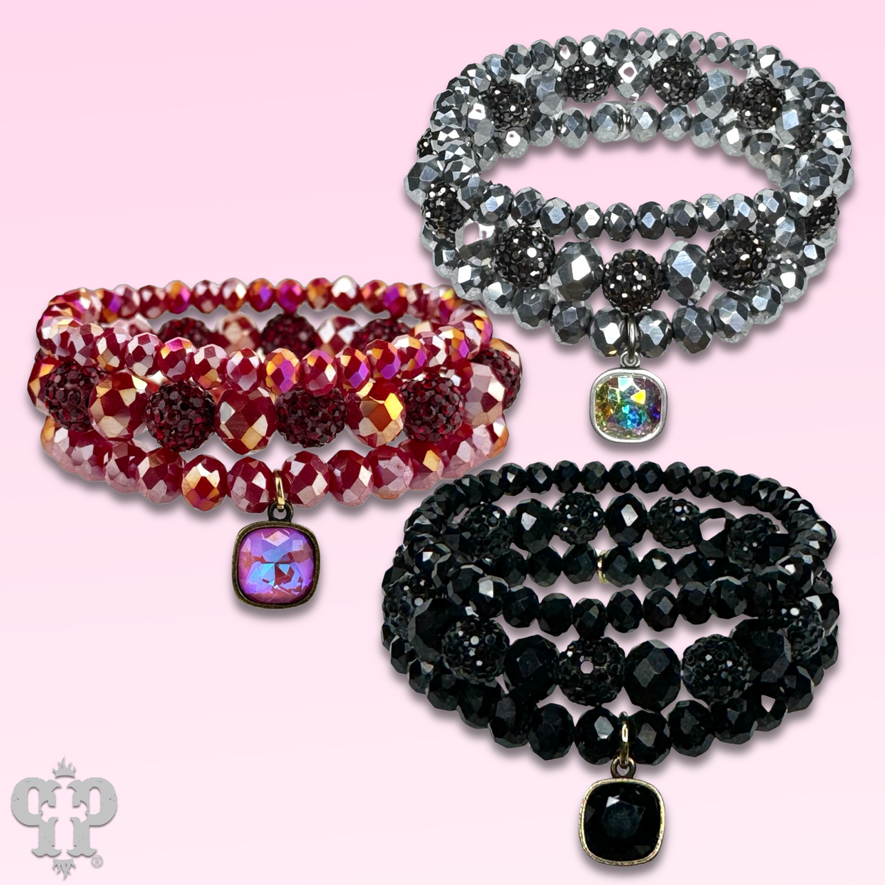 Add a touch of elegance to your outfit with our pave ball and glossy glass bead bracelet. Featuring three strands of glossy glass beads, stunning pave balls with an Austrian crystal drop, this accessory will fit any look. One size fits most.