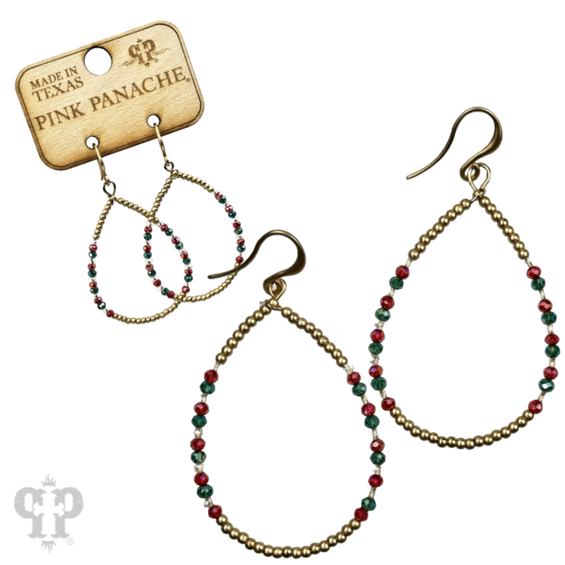 These teardrop earrings have a mix of gold tone round beads and faceted color beads. They hang on a french hook and measure approximately 1.75 inches in length.
