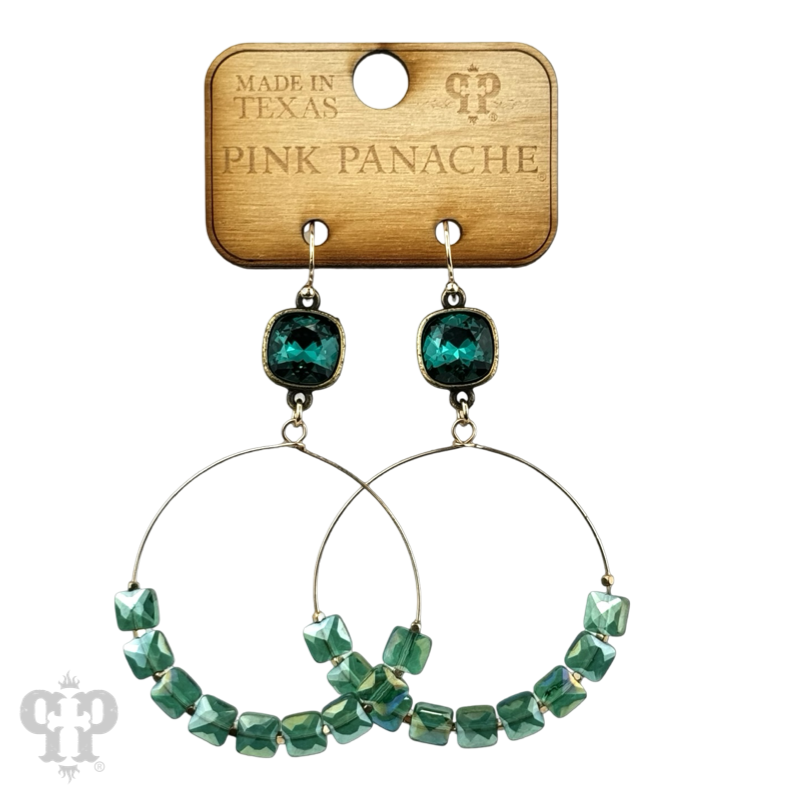 This earring has faceted flat beads threaded onto a circle shape. It hangs from a 10mm Austrian crystal in a setting that was custom made for Pink Panache in the USA. The earring measures approximately 3 inches and is on a french hook.