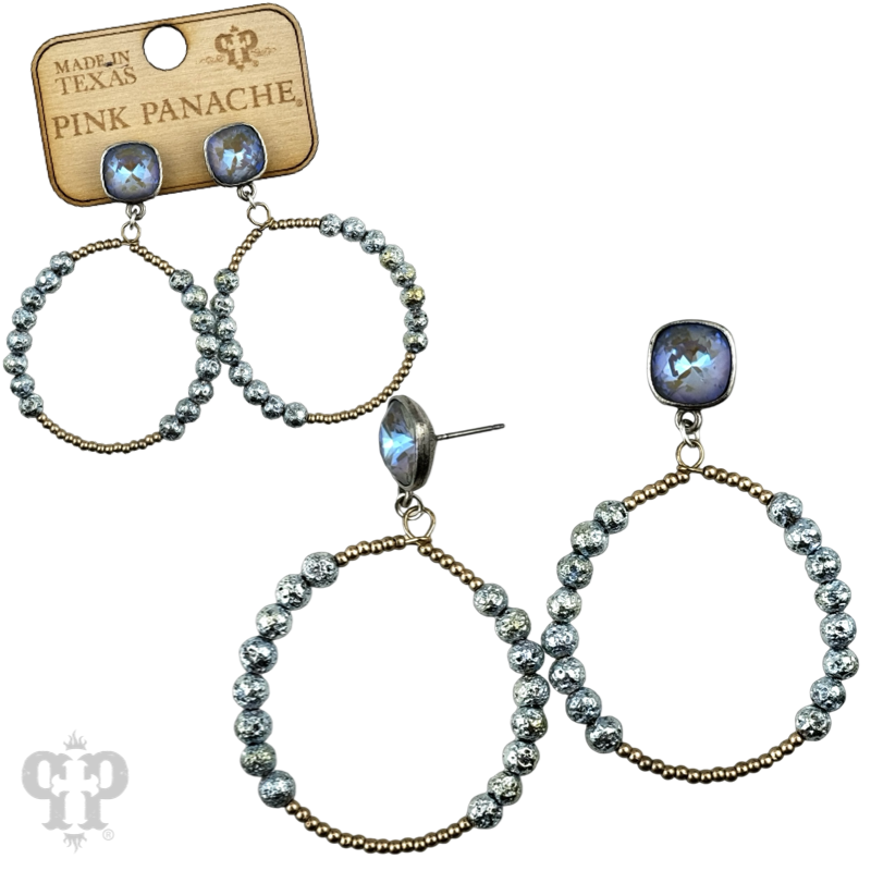 This earring sports a variety of beads in a circle and they hang from a 10mm Austrian crystal post in a setting that was custom made for Pink Panache in the USA.