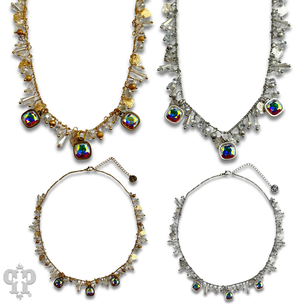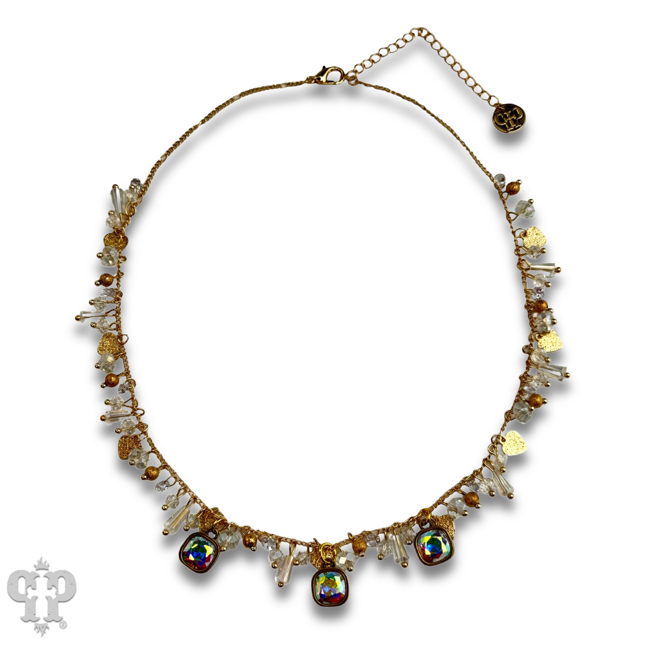 This necklace has a mix of crystal beads and crinkle texture heart charms with three Austrian crystals, in a setting custom made for Pink Panache in the USA, mixed in.