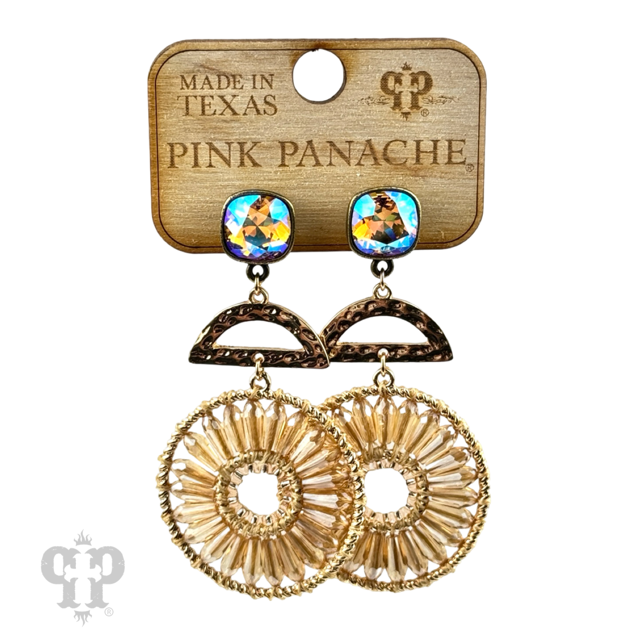 This unique earring has with a gold tone half circle and full gold tone circle with woven faceted teardrop beads. It hangs from a 10mm Austrian crystal post back setting custom made for Pink Panache in the USA.